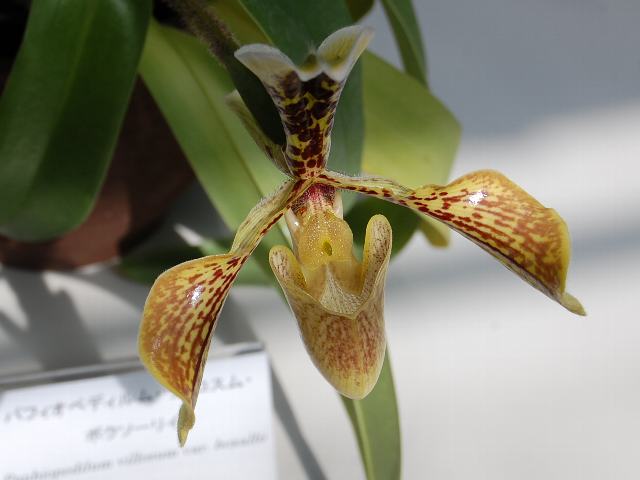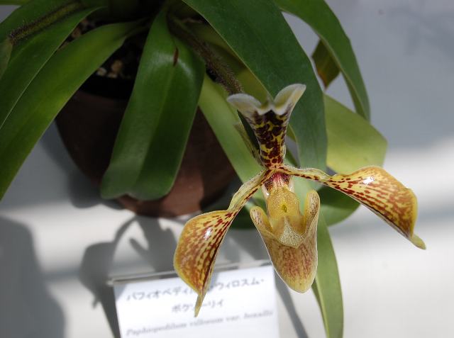 パフィオペディルム・ビロスム・ボクサリー 春の花 2012年03月17日 パフィオペディルム・ビロスム・ボクサリーはラン科トキワラン属(パフィオペディルム属)の多年草である。原産地はミャンマーで、標高1000~1200メートルの石灰岩地に生える地生種である。草丈は20~30センチである。葉は披針形(笹の葉のような形)である。開花時期は冬から春である。茎先に1輪の花をつける。花径は12~15センチくらいである。花の色は黄褐色である。背萼片は立ち上がり、濃い紅紫色の斑点が入る。属名の Paphiopedilum はギリシャ語の「Paphos(ビーナスの異名)+pedilon(サンダル)」からきている。種小名の villosum は「軟毛のある」という意味である。変種名の boxallii は19世紀のイギリス人のラン収集家「ボクサル(W. Boxall)さんの」という意味である。写真は3月につくば植物園の蘭展で撮った。学名:Paphiopedilum villosum var. boxallii★渋いけどワンポイントの味がある 大きく咲いたボクサリーの花花図鑑植物図鑑|味の麺匠戸田久|おこめの鬼平|フロム蔵王|花の本屋さん|楽天トラベル|