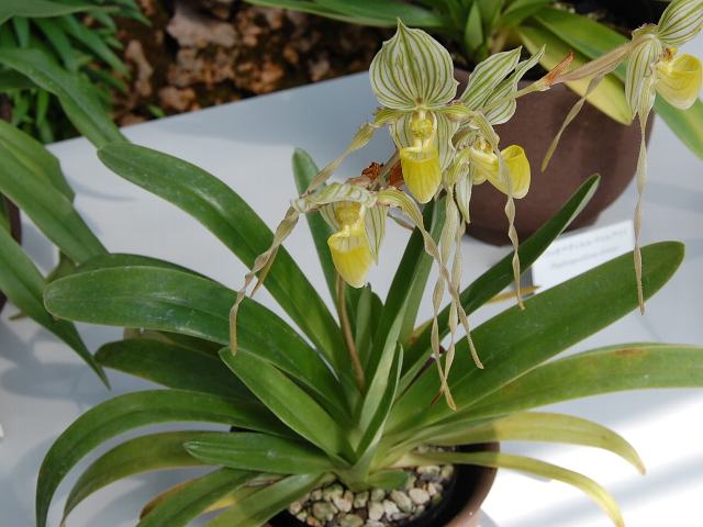 パフィオペディルム・フィリピネンセ 夏の花 2012年03月18日 パフィオペディルム・フィリピネンセはラン科トキワラン属(パフィオペディルム属)の多年草である。原産地はフィリピン、カリマンタン島で、標高500メートルまでの石灰岩地域に生える地生種である。草丈は60センチくらいである。葉は披針形(笹の葉のような形)である。開花時期は夏から秋である。茎先に3輪から5輪の花をつける。花径は20センチくらいある。萼片の色は白く、緑色の縦筋が入る。側花弁はねじれていて長い。唇弁は黄色である。属名の Paphiopedilum はギリシャ語の「Paphos(ビーナスの異名)+pedilon(サンダル)」からきている。種小名の philippinense は「フィリピンの」という意味である。写真は3月につくば植物園の蘭展で撮った。学名:Paphiopedilum philippinense★なかなかにお洒落な色合いしているよ 花はすっきりフィリピネンセ花図鑑植物図鑑|味の麺匠戸田久|おこめの鬼平|フロム蔵王|花の本屋さん|楽天トラベル|