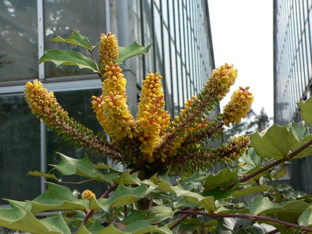 マホニア・マイレー 春の花 2012年03月19日 マホニア・マイレーはメギ科ヒイラギナンテン属の常緑低木である。原産地は東アジアから中国南西部の雲南省にかけた地域である。日本にも分布する柊南天(ヒイラギナンテン:Mahonia japonica)の近縁種である。樹高は2メートルくらいである。葉は奇数羽状複葉(鳥の羽のように左右に小葉がいくつか並び、先に1つの小葉がついて1枚の葉が構成される)で、互い違いに生える(互生)。葉の質は分厚い革質で、小葉の縁には先が針状になった粗いぎざぎざ(鋸歯)がある。開花時期は3~4月である。枝先に総状花序(柄のある花が花茎に均等につく)を出し、黄色い花をたくさんつける。花の後にできる実は液果(果皮が肉質で液汁が多い実)である。近縁種の柊南天(ヒイラギナンテン)に比べ、花穂が太くて大きい。属名の Mahonia は19世紀のアメリカ人の植物学者「マクマホン(B. Mc. Mahon)さん」の名からきている。種小名の mairei は「マイレ(Maire)さんの」という意味である。写真は4月につくば植物園で撮った。学名:Mahonia mairei★ずんぐりと太い花穂にびっしりと 黄花ちりばめマホニア・マイレー花図鑑植物図鑑|味の麺匠戸田久|おこめの鬼平|フロム蔵王|花の本屋さん|楽天トラベル|