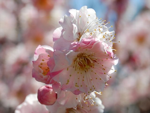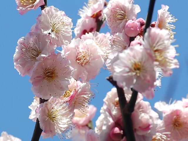 司絞り(ツカサシボリ) 春の花 2012年03月22日 梅(ウメ)はバラ科サクラ属の落葉小高木である。中国原産で、日本へは古代に渡来した。司絞り(ツカサシボリ)はその栽培品種の1つである。樹高は3~6メートルくらいである。葉は楕円形で、互い違いに生える(互生)。開花時期は3月から4月である。比較的遅咲きの品種である。「絞り」というのは、絞り染めのように色がまだらに入りまじっているものにつけられる名である。葉の展開に先立って花を咲かせる。野梅系・野梅性で淡い紅色と紅色を咲き分ける八重咲きの大輪(30から40ミリ)である。属名の Prunus は「plum(スモモ)」を意味する。種小名の mume は「梅」のことである。写真は3月に墨田区文花の香取神社香梅園で撮った。学名:Prunus mume 'Tsukasashibori'★絞りの名まさにそうだと頷ける 司絞りは花色精緻花図鑑植物図鑑|味の麺匠戸田久|おこめの鬼平|フロム蔵王|花の本屋さん|楽天トラベル|PR