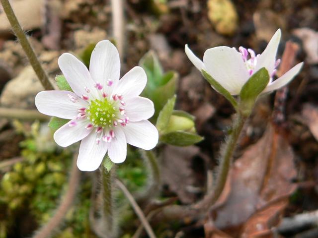 洲浜草(スハマソウ) 春の花 2012年03月02日 洲浜草(スハマソウ)はキンポウゲ科ミスミソウ属の多年草である。本州(東北、関東)の太平洋側と四国に分布し、山地の日陰に生える。雪割草(ユキワリソウ)と呼ばれるものの1つである。早春に花茎を伸ばして雪を割るようにして咲き出すことからつけられた名である。雪割草(ユキワリソウ)の原種は、日本に自生する三角草(ミスミソウ)、大三角草(オオスミソウ)、洲浜草(スハマソウ)、毛洲浜草(ケスハマソウ)の4種のほか、海外に9種ほどあるそうだ。これらの交配によって、鮮やかで豪華な園芸品種が造り出されている。洲浜草(スハマソウ)は草丈が10~20センチくらいである。根際から生える葉は三角形で、浅く3つに裂け、先は円い。花色は白が基本だが、ピンク、ブルー、薄紫など多彩である。なお、花弁のように見えるのは萼片である。萼片の数には幅があり、6~15枚くらいである。花の後にできる実はそう果(熟しても裂開せず、種子は1つで全体が種子のように見えるもの)である。三角草(ミスミソウ)は、三つに裂けた葉の角が尖っている。これに対して洲浜草(スハマソウ)は、葉の角が丸くなっている。和名の由来は、葉の角が丸くなっているのを「洲浜」(弧状になった砂浜)に見立てたものである。俳句の季語は春である。属名の Hepatica はラテン語の「hepaticus(肝臓)」からきている。葉の形から名づけられたものである。種小名の nobile は「気品のある」という意味である。変種名の japonica は「日本の」という意味である。品種名の variegata は「斑入りの」という意味である。写真は3月に板橋区立赤塚植物園で撮った。学名:Hepatica nobilis var. japonica f. variegata★指ほどの高さに咲いて洲浜草 土の温もりあるやあらぬや花図鑑植物図鑑|味の麺匠戸田久|おこめの鬼平|フロム蔵王|花の本屋さん|楽天トラベル|