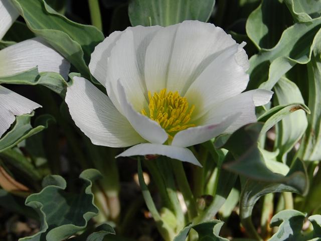 羽衣金鳳花(ハゴロモキンポウゲ) 春の花 2012年03月03日 羽衣金鳳花(ハゴロモキンポウゲ)はキンポウゲ科キンポウゲ属の多年草である。学名のラヌンキュルス・カランドリニオイデスでも流通している。原産地はモロッコのアトラス山脈である。草丈は15~30センチくらいである。根際から生える葉は帯状である。開花時期は2~3月である。大輪の白い花をつける。花びら(萼片)は5枚である。花の真ん中には雄しべと雌しべがたくさんある。花の後にできる実はそう果(熟しても裂開せず、種子は1つで全体が種子のように見えるもの)である。属名の Ranunculus はラテン語の「rana(蛙)」からきている。この属の水生の種が蛙の棲むような所に生えることから名づけられた。種小名の calandrinioides は「(スベリヒユ科の)カランドリニア属(Calandrinia)に似た」という意味である。写真は3月に川口市立グリーンセンターの野草展で撮った。学名:Ranunculus calandrinioides★早春のアトラスの山に花開く 姿思いて鉢を眺めて花図鑑植物図鑑|味の麺匠戸田久|おこめの鬼平|フロム蔵王|花の本屋さん|楽天トラベル|