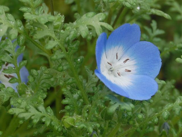 瑠璃唐草(ルリカラクサ) 春の花 2012年03月04日 瑠璃唐草(ルリカラクサ)はハゼリソウ科ルリカラクサ属(ネモフィラ属)の一年草である。分類体系によってはムラサキ科とされる。原産地はアメリカのカリフォルニア州である。草地や林の中に生える。学名のネモフィラ・メンジーシーでも流通している。日本へは大正時代の初めに渡来し、春の花壇用の花となった。草丈は30センチから40センチくらいである。葉は羽状に深く裂ける。開花時期は3月から5月である。花径は2、3センチくらいである。花びら(花弁)は5枚である。それぞれの花びらのつけ根は白く、先は淡いブルーである。雄しべは5本である。花の後にできる実はさく果(熟すると下部が裂け、種子が散布される果実)である。和名の由来は、花色が瑠璃色で、葉っぱが唐草模様に似ているところからきている。属名の Nemophila はギリシャ語の「nemos(小さな森)+ phileo(愛する)」からきている。種小名の menziesii はスコットランドの植物学者「メンジーズ(A. Menzies)さん」の名からきている。写真は3月に京都府立植物園で撮った。学名:Nemophila menziesii★花びらの先はきれいな空の色 彩る葉っぱ唐草模様花図鑑植物図鑑|味の麺匠戸田久|おこめの鬼平|フロム蔵王|花の本屋さん|楽天トラベル|