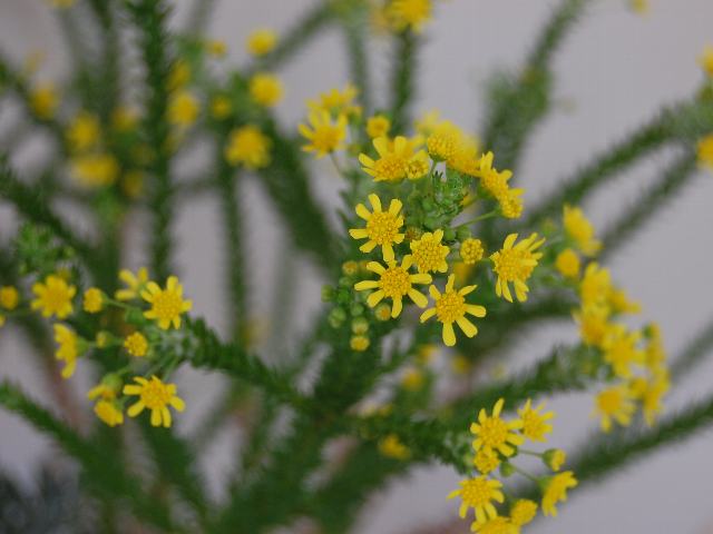 ゴールデンクラッカー 春の花 2012年02月27日 エウリオプス・ビルギネウスはキク科エウリオプス属の常緑低木である。原産地は南アフリカである。ユリオプス・デージーと同じ仲間の植物である。ゴールデンクラッカー(Golden Cracker)はその園芸品種である。名前の通りはじけるように花を咲かせる。樹高は1~4メートルくらいである。葉は針形で密に互い違いに生える(互生)。開花時期は1~5月くらいである。枝先に小さな黄色い花をまとまってつける。花の後にできる実はそう果(熟しても裂開せず、種子は1つで全体が種子のように見えるもの)である。属名の Euryops はギリシャ語の「eurys(大きな)+ops(目)」からきている。目立つ花を咲かせることを表したものである。種小名の virgineus は「清らかな」という意味である。品種名の Golden Cracker は「金色のクラッカー」という意味である。写真は2月に神奈川県立フラワーセンター大船植物園で撮った。学名:Euryops virgineus 'Golden Cracker'★面白い名前の通り弾け咲く 目にも鮮やか黄金の小花花図鑑植物図鑑|味の麺匠戸田久|おこめの鬼平|フロム蔵王|花の本屋さん|楽天トラベル|