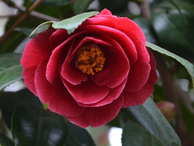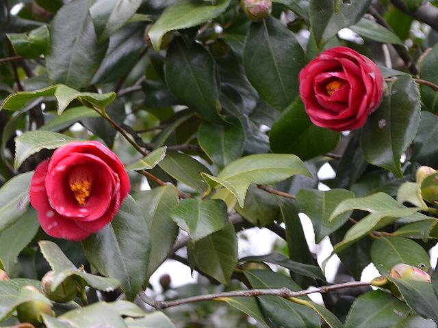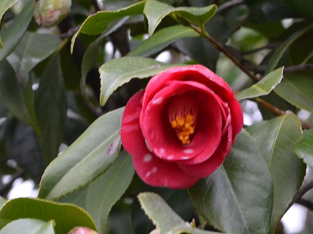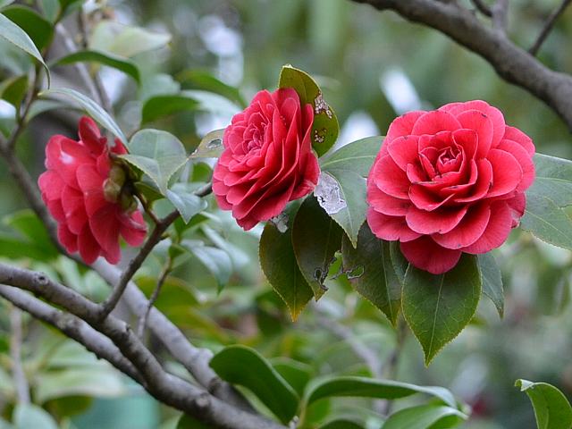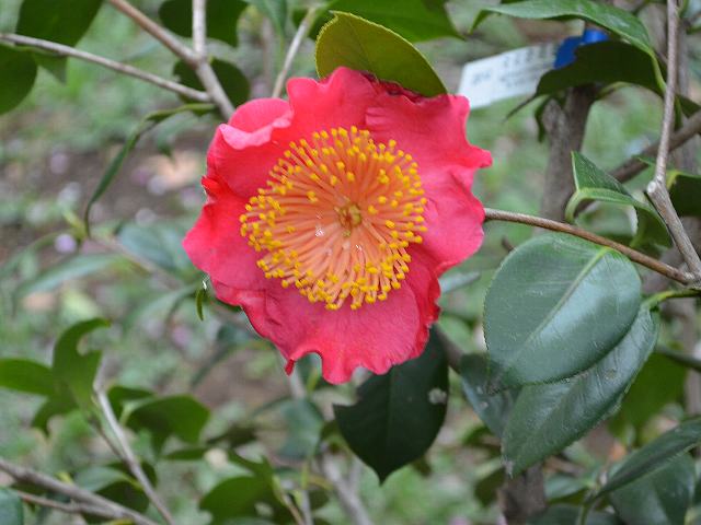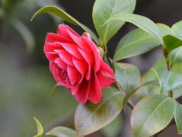 藻汐(モシオ) 春の花 2016年03月19日 藪椿(ヤブツバキ)はツバキ科ツバキ属の常緑低木から高木である。本州の青森県から沖縄にかけて分布する。一般的に椿(ツバキ)と呼ばれ、園芸品種の基本種となっている。藻汐(モシオ)もそうした園芸品種の1つである。(椿図鑑参照)桃色地の沖の浪(オキノナミ)の枝変わりである。江戸時代からある古い品種である。1859年刊行の糀屋亀五郎編纂「椿伊呂波名寄色附」に記載されている。藻塩(藻汐)は海草から採る塩のことで、藤原定家の和歌にも詠まれており、転じて随筆や随筆集などを指すことばとなっている。樹高は2メートルから4メートルである。葉は長い楕円形で、向かい合って生える(対生)。開花時期は2月から4月である。花径10センチくらいの鮮やかな濃い紅色の八重蓮華咲きの中輪ないし大輪をつける。蓮華咲きというのは横から見ると花弁と花弁の間に隙間があり、立体感のある花形である。雄しべは筒しべである。属名の Camellia はモラビアの出身でイエズス会の宣教師だった「カメル(Georg Joseph Kamel, 1661-1706)さん」の名からきている。マニラに住み、東アジアの植物を採集した。種小名の japonica は「日本の」という意味である。写真は3月に埼玉県花と緑の振興センターで撮った。学名:Camellia japonica 'Mosio'★この花はこれから開くところだな 開いた花も今度は撮ろう花図鑑植物図鑑ミラーサイト|味の麺匠戸田久|おこめの鬼平|フロム蔵王|花の本屋さん|楽天トラベル|