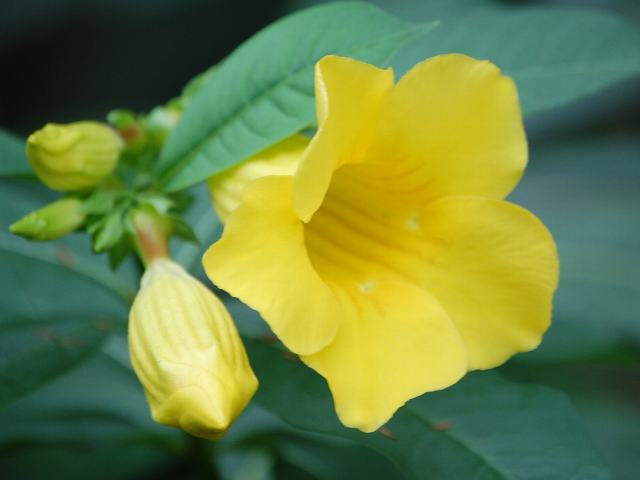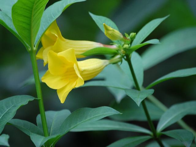 姫有明葛 (ヒメアリアケカズラ) 四季咲きの花 2012年01月16日 姫有明葛 (ヒメアリアケカズラ)はキョウチクトウ科アリアケカズラ属の常緑低木である。原産地はブラジルである。有明葛 (アリアケカズラ:Allamanda cathartica)は半蔓性だが、本種は常緑低木である。英名はブッシュ・アラマンダ(bush allamanda)である。樹高は120~150センチくらいである。葉は長めの楕円形で、3枚から5枚が向かい合って生える(対生)。輪生をすることもある。開花時期は周年である。花は枝先に集まってつく。濃い黄色のラッパ状の花で、花冠の内側には淡い赤褐色の筋がある。なお、「有明」の名のつく花には黄花が多い。花の後にできる実は袋果(熟すと果皮が自然に裂けて種子を放出する)で、栗のイガのような形をしている。属名の Allamanda はスイス人の植物学者「アラマン(J. N. S. Allamand)さん」の名からきている。種小名の neriifolia は「キョウチクトウ属(Nerium)のような葉の」という意味である。写真は7月に東京都薬用植物園で撮った。学名:Allamanda neriifolia★筒形の花は黄金の色をして 中にほっそり紅の筋つけ花図鑑植物図鑑|味の麺匠戸田久|おこめの鬼平|フロム蔵王|花の本屋さん|楽天トラベル|