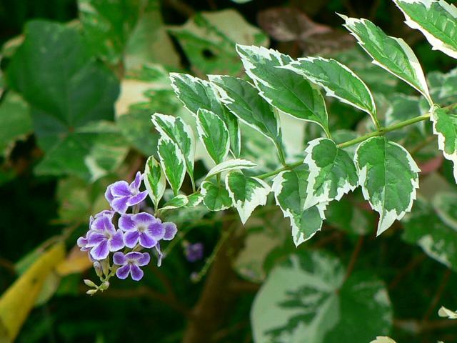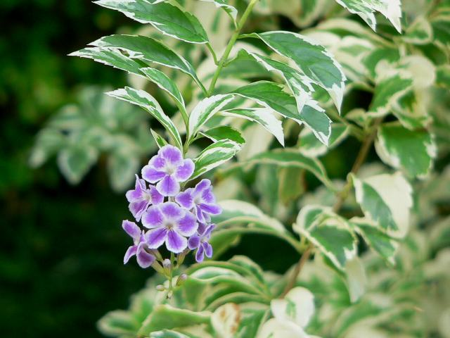 斑入り台湾連翹(フイリタイワンレンギョウ) 四季咲きの花 2012年01月17日 斑入り台湾連翹(フイリタイワンレンギョウ)はクマツヅラ科ハリマツリ属の常緑低木である。分類上は、台湾連翹(タイワンレンギョウ)の園芸品種である。特徴は、葉に白い斑が入ることである。台湾連翹(タイワンレンギョウ)の原産地は、西インド諸島やメキシコである。日本へは明治時代の中期に渡来した。別名を針茉莉(ハリマツリ)という。「斑入り」のほうはデュランタ・バリエガタの名でも流通している。樹高は2~5メートルくらいである。よく枝分かれをする。葉は楕円形で、向かい合って生える(対生)。葉の先は尖り、縁にはぎざぎざ(鋸歯)がある。開花時期は5~11月である。暖地では周年性がある。枝垂れた枝先に総状花序(柄のある花が花茎に均等につく)を出し、小さい紫色の花をたくさんつける。花冠は5つに裂ける。花の後にできる実は球形の液果(果皮が肉質で液汁が多い実)で、熟すと黄色くなる。枝に棘があることから、生垣としてよく利用される。属名の Duranta はローマ法王の侍医で植物学者の「デュランテス(C. Durantes)さん」の名からきている。種小名の repens は「匍匐する」という意味である。品種名の Variegata は「斑入りの」という意味である。写真は11月に沖縄市の東南植物楽園で撮った。学名:Duranta repens 'Variegata'★花も実も見てほしいけど一番の 自慢は葉っぱとても綺麗よ花図鑑植物図鑑|味の麺匠戸田久|おこめの鬼平|フロム蔵王|花の本屋さん|楽天トラベル|