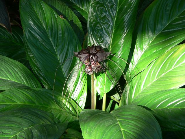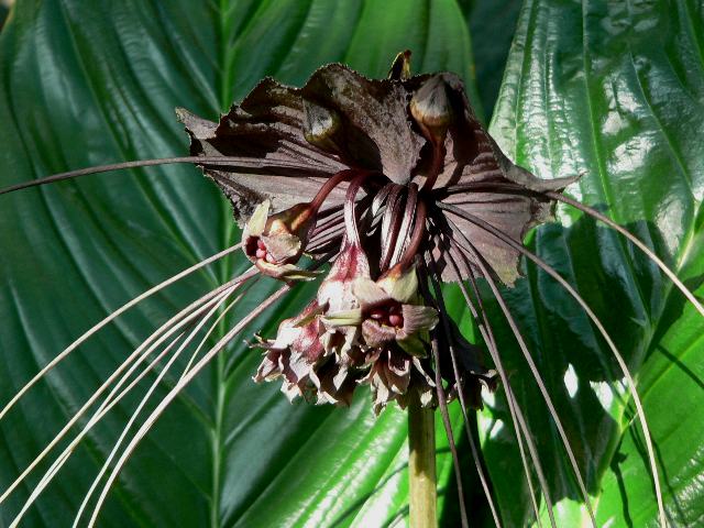 ブラックキャット 四季咲きの花 2012年01月18日 ブラックキャット(black cat)はタシロイモ科タシロイモ属の多年草である。原産地は中国の雲南省から東南アジアである。草丈は40~80センチくらいである。根際から生える葉は広い披針形で、淡い緑色をしている。開花時期は5~10月だが、暖地では周年開花をする。花序は散形花序(枝先に1個つずつ花がつく)である。2~12枚のマントのような黒褐色の総苞片に包まれる。長く伸びて目立つ髭のような糸状の器官は、苞ともいわれ、花のつかない花柄ともいわれる。花は暗紫褐色の6枚の花被片からなる。花の後にできる実は液果(果皮が肉質で液汁が多い実)である。現地では、地下茎を食用とし、若葉と花はカレー料理に用いられる。 和名は黒花田代芋(クロバナタシロイモ)という。学名のタッカ・シャントリエリで表示をする場合もある。種小名の読み方は「カントリエリ」とするものもある。属名のタッカでも流通している。属名の Tacca はマレーでの現地語からきている。種小名の chantrieri はフランス人の園芸家「シャントリエ(Chantrier Freres)さんの」という意味である。写真は11月に新宿御苑で撮った。学名:Tacca chantrieri★造形の不思議を見せる咲き姿 魅力に富んだブラックキャット花図鑑植物図鑑|味の麺匠戸田久|おこめの鬼平|フロム蔵王|花の本屋さん|楽天トラベル|