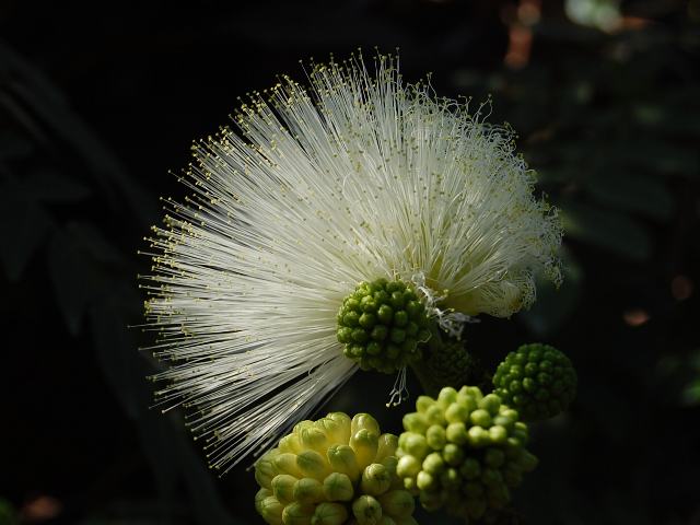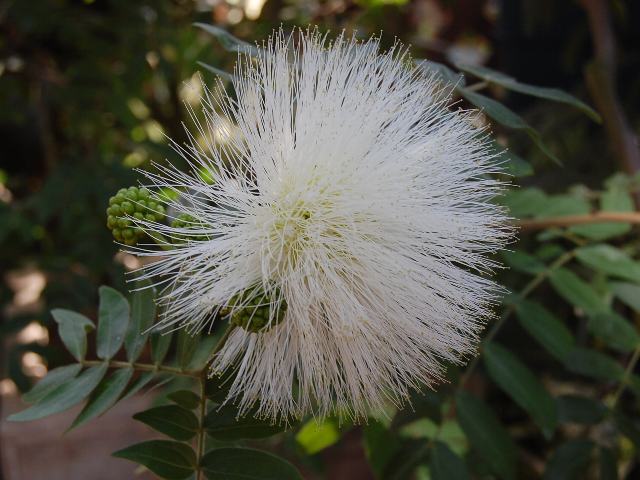ホワイト・パウダーパフ 冬の花 2012年01月19日 ホワイト・パウダーパフ(white powederpuff)はマメ科ベニゴウカン属(カリアンドラ属)の常緑低木である。原産地はボリビアである。属名のカリンアンドラ(Calliandra)の名でも流通している。カリンアンドラは美しい雄しべを意味する。白く伸びているのは雄しべである。ホワイト・パウダーパフは英名である。赤花のものもあり、大紅合歓(オオベニゴウカン)と呼ばれる。こちらのほうの英名はレッド・パウダーパフ(red powederpuff)である。本種はその園芸品種である。樹高は2~3メートルである。葉は羽状複葉(鳥の羽のように左右に小葉がいくつか並んで1枚の葉が構成される)で、互い違いに生える(互生)。小葉の形は細長い卵形である。開花時期は12~3月くらいである。花の後にできる実は豆果(莢の中に種子が入るもの)である。属名の Calliandra はギリシャ語の「kallos (美しい) + andros ( 雄しべ)」からきている。種小名の haematocephala は「血の色をした頭状の部分のある」という意味である。品種名の Albiflora は「白い花の」という意味である。写真は1月に川口市立グリーンセンターで撮った。学名:Calliandra haematocephala 'Albiflora'★不思議なる花の形で人気呼ぶ カリンアンドラはボリビア育ち花図鑑植物図鑑|味の麺匠戸田久|おこめの鬼平|フロム蔵王|花の本屋さん|楽天トラベル|PR