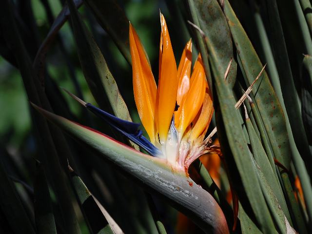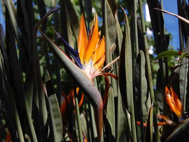 ストレリチア・ユンケア 四季咲きの花 2012年01月10日 ストレリチア・ユンケアはバショウ科ゴクラクチョウカ属(ストレリチア属)の多年草である。分類体系によってはゴクラクチョウカ科とされる。原産地は南アフリカのケープ地方である。分類上は、極楽鳥花(ゴクラクチョウカ)の変種とするものと独立種とするものがある。草丈は1~3メートルくらいである。葉が円柱形になり、茎のように見えるのが特徴である。そのためノンリーフ・ストレリチアの名でも流通している。開花時期は周年である。花の形は極楽鳥花(ゴクラクチョウカ)と変わりがない。橙黄色の鶏冠のように見えるのが花(萼片)である。くちばしのように見えるのは苞(花のつけ根につく葉の変形したもの)である。花の後にできる実はさく果(熟すると下部が裂け、種子が散布される果実)である。属名の Strelitzia はイギリスのジョージ3世の皇后の出身家「ストレリッツ(Strelitz)」にちなむ。種小名の reginae は「女王の」という意味である。変種名の juncea は「イグサ属(Juncus)に似た」という意味である。写真は2月に神奈川県立フラワーセンター大船植物園で撮った。学名:Strelitzia reginae var. juncea(=Strelitzia jancea)★ユンケアの葉っぱはまるで茎のよう 華麗な花は簾の中に花図鑑植物図鑑|味の麺匠戸田久|おこめの鬼平|フロム蔵王|花の本屋さん|楽天トラベル|