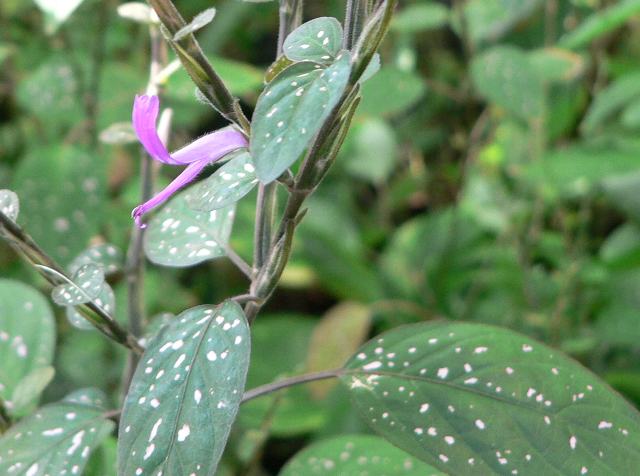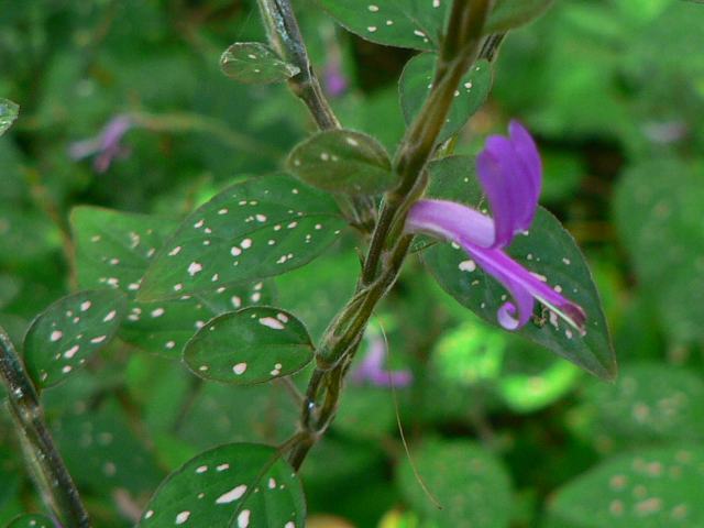 雀斑草(ソバカスソウ) 冬の花 2012年01月12日 雀斑草(ソバカスソウ)はキツネノマゴ科ヒポエステス属の常緑多年草である。原産地はマダガスカル島である。草丈は10~40センチくらいである。葉は卵形で、向かい合って生える(対生)。緑色の葉に白や赤、ピンクの斑が入る。その様子を「雀斑」に見立てたのが名の由来である。開花時期は10~3月くらいである。葉の脇から花茎を出し、白や紅紫色の小さな花をつけるが、主に観葉植物とされる。花の後にできる実はさく果(熟すると下部が裂け、種子が散布される果実)である。学名のヒポエステス・フィロスタキアで表示をするところもある。属名の Hypoestes はギリシャ語の「hypo(下)+estia(家)」からきている。萼が苞に被われた花の形から名づけられた。種小名の phyllostachya は「葉状の穂の」という意味である。写真は11月に新宿御苑で撮った。学名:Hypoestes phyllostachya★緑葉にきれいな模様点々と 雀斑草の不思議な魅力花図鑑植物図鑑|味の麺匠戸田久|おこめの鬼平|フロム蔵王|花の本屋さん|楽天トラベル|