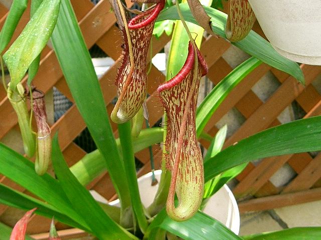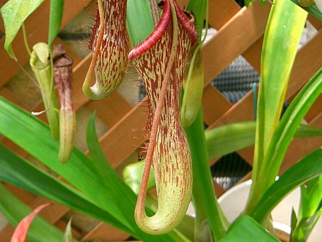 靫葛(ウツボカズラ) 観葉植物 2011年12月26日 靫葛(ウツボカズラ) はウツボカズラ科ウツボカズラ属(ネペンテス属)の常緑蔓性低木である。原産地はスマトラ島、カリマンタン島などである。調査が進むにつれて新種が次々に発見されているという。代表的な食虫植物で、壷状の袋に落ちた虫を消化して栄養にする。生育している場所が十分な栄養のとれない環境なので、足りない養分を虫を食べて補っているのである。樹高は1~2メートルである。葉は楕円形で、互い違いに生える(互生)。葉は薄い革質である。葉の先が細長く伸び、その先端に壷状の捕虫器をつける。雌雄異株で、雄花と雌花は別の株につく。花は小さく、目立たない。名の由来は、壷状の袋を靫(矢を入れる筒状の容器)に見立てたものである。日本では、観賞用として温室栽培されている。属名の Nepenthes はギリシャ語の「ne(無)+penthos(憂)」からきている。捕虫嚢にある液体を例えたものと思われる。写真は6月に神奈川県立フラワーセンター大船植物園で撮った。学名:Nepenthes sp.★おびき寄せ虫を捕らえる不思議花 靫葛は静けさの中花図鑑植物図鑑|味の麺匠戸田久|おこめの鬼平|フロム蔵王|花の本屋さん|楽天トラベル|