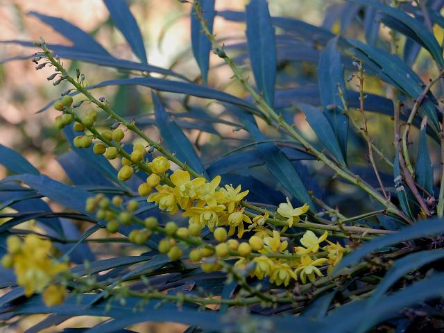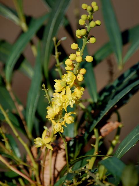 マホニア・ナリヒラ 冬の花 2011年12月28日 マホニア・コンフーサはメギ科ヒイラギナンテン属(マホニア属)の常緑低木である。原産地は中国の西部で、貴州省、湖北省、四川省などに分布する。ナリヒラ(Narihira)はその園芸品種である。業平柊南天(ナリヒラヒイラギナンテン)の名でも流通している。樹高は1~2メートルである。葉は奇数羽状複葉(鳥の羽のように左右に小葉がいくつか並び、先に1つの小葉がついて1枚の葉が構成される)で、枝先に集まって互い違いに生える(互生)。小葉の形は細長い楕円形である。小葉の先は尖り、縁にはぎざぎざ(鋸歯)がある。葉の質が軟らかいので、触っても近縁種の柊南天(ヒイラギナンテン)の葉のように痛くはない。開花時期は10~12月くらいである。枝先に複数の総状花序(柄のある花が花茎に均等につく)を出し、黄色い小さな花をたくさんつける。花の少ない時期に咲くことから人気がある。花弁は6枚、萼片は9枚、雄しべは6本である。花の後にできる実は球形の液果(水分が多く柔らかい果皮をもつ果実)で、4~6月くらいに黒紫色に熟する。属名の Mahonia はアメリカの植物学者「マクマホン(B. Mc. Mahon)さん」の名からきている。種小名の confusa は「混乱した」という意味である。写真は11月に埼玉県花と緑の振興センターで撮った。学名:Mahonia confusa 'Narihira'★花のない季節彩る業平は 花穂きらめく小春日の午後花図鑑植物図鑑|味の麺匠戸田久|おこめの鬼平|フロム蔵王|花の本屋さん|楽天トラベル|