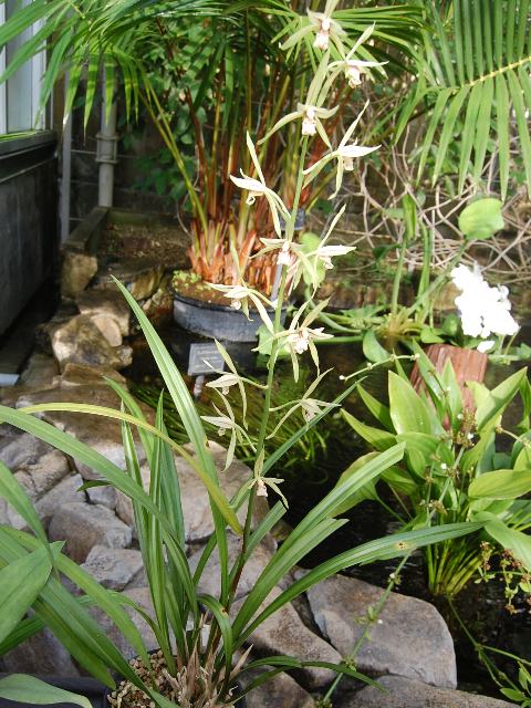 シンビジウム・エンシフォリウム 冬の花 2011年11月30日 シンビジウム・エンシフォリウムはラン科シュンラン属の常緑多年草である。日本では九州の長崎県、熊本県に分布する。海外では中国、ベトナム、カンボジア、インドネシアなどに分布する。和名は駿河蘭(スルガラン)という。和名の由来は、駿河地方で園芸用に栽培されていたことからきている。環境省のレッドリスト(2007)では、「ごく近い将来における絶滅の危険性が極めて高い種」である絶滅危惧ⅠA類(CR)に登録されている。草丈は40センチくらいである。葉は剣状である。開花時期は冬である。茎先に花径6センチくらいの淡い緑色の花をつける。属名の Cymbidium はギリシャ語の「cymbe(舟)+eidso(形)」からきている。唇弁の形から名づけられた。種小名の ensifolium は「剣形葉の」という意味である。写真は12月につくば植物園で撮った。学名:Cymbidium ensifolium★落ち着いた色合い見せる駿河蘭 一目でわかる東洋の花花図鑑植物図鑑