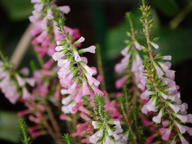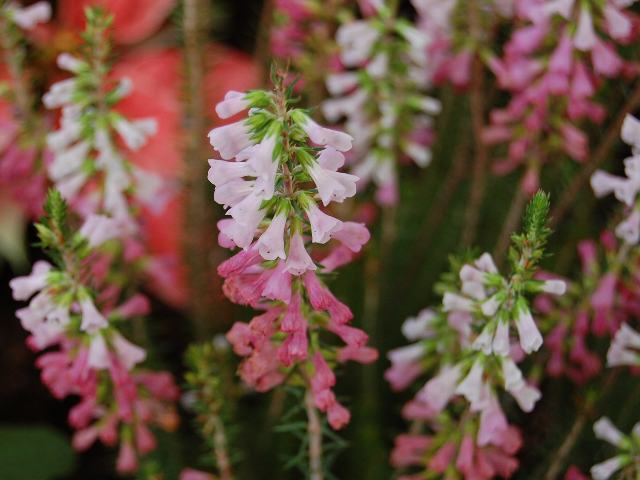 エリカ・コニカ 秋の花 2011年12月01日 エリカ・コニカはツツジ科エリカ属の常緑小低木である。原産地は南アフリカのケープ地方である。樹高は30~50センチくらいである。幹は直立をする。葉は針状の細い線形で、密に生える。開花時期は10~12月くらいである。暗い桃色をした鐘形の小さな花を横向きにたくさんつける。花の後にできる実はさく果(熟すると下部が裂け、種子が散布される果実)である。属名の Erica はギリシャ語の「erion(軟毛)」からきている。全体に軟毛が生える種類の多いことから名づけられた。種小名の conica は「円錐形の」という意味である。写真は11月に千葉市花の美術館で撮った。学名:Erica conica★秋咲きのエリカコニカは小さくて お伽の国を思わす姿花図鑑植物図鑑