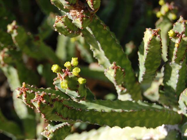 ユーフォルビア・プセウドカクツス・リットニアナ 冬の花 2011年12月03日 ユーフォルビア・プセウドカクツスはトウダイグサ科トウダイグサ属の常緑多年草である。南アフリカのナタール地方に分布する多肉植物である。リットニアナ(Lyttoniana)はその園芸品種である。文献によっては変種扱いをしている。草丈は20~30センチである。茎は柱状で4~5稜がある。開花時期は冬から春である。花の色は黄色である。基本種は流通名を春駒(ハルコマ)という。属名の Euphorbia はローマ時代の医師「エウフォルブスさん(Euphorbus)」の名からきている。この属の植物の乳液を初めて薬にしたことから名づけられた。種小名の pseudocactus は「サボテンに似た」という意味である。写真は1月につくば植物園である。学名:Euphorbia pseudocactus 'Lyttoniana'★サボテンとどこが違っているのかな 面白いよね多肉植物花図鑑植物図鑑