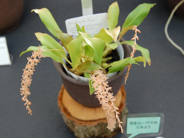 デンドロキルム・コンバラリアエフォルメ・ミノル 冬の花 2011年12月04日 デンドロキルム・コンバラリアエフォルメ・ミノルはラン科デンドロキルム属の多年草である。フィリピンに分布する着生種である。草丈は20センチくらいである。葉は披針形(笹の葉のような形)である。開花時期は12~3月である。花茎を垂れ下げ小さな花をたくさんつける。花の色は淡い朱色である。属名の Dendrochilum はギリシャ語の「dendron(樹)+ cheilos(唇弁)」からきている。種小名の convallariaeforme はの「スズラン属のような外形の」という意味である。変種名の minor は「より小さい」という意味である。写真は1月につくば植物園で撮った。学名:Dendrochilum convallariaeforme var. minor★ネックレス垂らしたような咲き方に 思わず微笑む小人の世界花図鑑植物図鑑PR