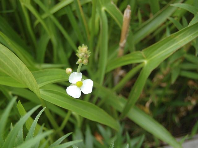顎無(アギナシ) 秋の花 2011年10月26日 顎無(アギナシ)はオモダカ科オモダカ属の多年草である。北海道から九州にかけて分布し、沼地や湿原などに生える。海外では、朝鮮半島にも分布する。環境省のレッドリスト(2007)では、「現時点では絶滅危険度は小さいが、生息条件の変化によっては『絶滅危惧』に移行する可能性のある種」である準絶滅危惧(NT)に登録されている。草丈は40~80センチくらいである。若葉は細い楕円形であるが、成長すると葉の下側が2つに分かれ、やじり形となる。この若葉の形状を「顎無し」と見立てたのが名の由来である。葉は根際から生え、長い柄がある。葉の縁にぎざぎざ(鋸歯)はない。開花時期は7~10月である。雌雄同株である。茎先に円錐花序(枝分かれして全体が円錐状に見える)を出し、雄花をつける。雌花は茎の下部につく。いずれも白い3弁花で、萼片も3枚である。花の後にできる実はそう果(熟しても裂開せず、種子は1つで全体が種子のように見えるもの)の集合果である。近縁種の沢瀉(オモダカ)と似るが、顎無(アギナシ)は花を葉よりも高い位置につけることや球芽(むかご)のあることなどで見分ける。属名の Sagittaria はラテン語の「sagitta(矢)」からきている。矢形をした葉の様子から名づけられた。種小名の aginashi は日本語の「アギナシ」のことである。写真は7月に箱根湿生花園で撮った。学名:Sagittaria aginashi★名の由来聞けば何やら面白い 顎無の花風にゆらゆら花図鑑植物図鑑