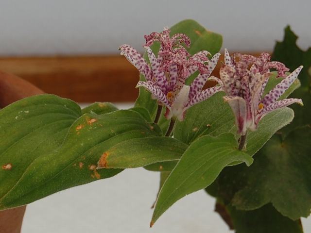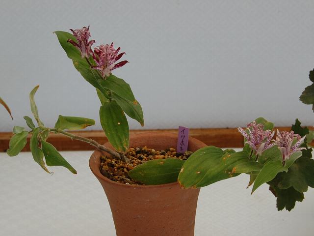 岩杜鵑草(イワホトトギス) 秋の花 2011年10月28日 岩杜鵑草(イワホトトギス)はユリ科ホトトギス属の多年草である。長野県の固有種で、渓流沿いに垂れ下がって咲く。長野県のRDBで絶滅危惧IB類(EN)に登録されている。分類上は杜鵑草(ホトトギス)の変種とされている。草丈は40センチから100センチくらいである。葉は細長い楕円形で、互い違いに生える(互生)。葉の縁にぎざぎざ(鋸歯)はなく、つけ根は茎を抱く。開花時期は9月から10月である。葉の脇に白地に紫の斑点がある花を1輪から3輪上向きにつける。花びら(花被片)は6枚で、斜め上に向かって開く。花の後にできる実はさく果(熟すると下部が裂け、種子が散布される果実)である。属名の Tricyrtis はギリシャ語の「treis(3)+cyrtos(曲)」からきている。3枚の外花被のつけ根の部分が袋状に曲がっていることから名づけられた。種小名の hirta は「短い剛毛のある」という意味である。変種名の saxicola は「岩の間に生える」という意味である。写真は10月に神代植物公園の野草展(東京山草会)で撮った。学名:Tricyrtis hirta var. saxicola★謎多き花の姿に触れてみて あれやこれやと思いめぐらし花図鑑植物図鑑