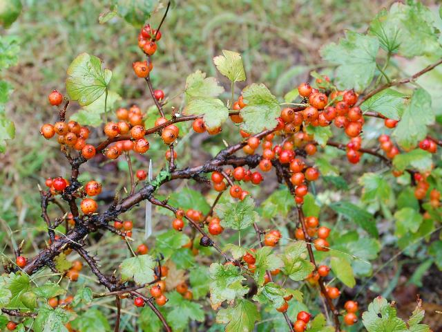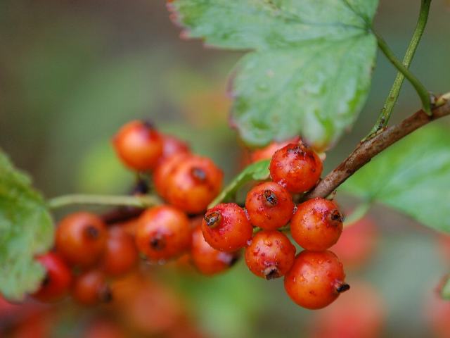 藪山査子(ヤブサンザシ) 果実・野菜 2011年10月29日 藪山査子(ヤブサンザシ)はユキノシタ科スグリ属の落葉低木である。分類体系によってはスグリ科とされる。本州から九州にかけて分布し、林の縁や明るい林の中などに生える。海外では、朝鮮半島や中国にも分布する。和名の由来は、実が山査子(サンザシ)に似ていて藪に生えることからきている。樹高は1メートルくらいである。樹皮は紫褐色で、縦に裂けて薄く剥がれる。葉は単葉で互い違いに生え(互生)、広めの卵形で3つから5つに裂ける。開花時期は4~5月である。雌雄異株である。葉脈に数個ずつ目立たない黄色の花をつける。5つの花弁に見えるものは萼で、萼は反り返る。結実期は10~11月である。雌株に球形の小さな球形の液果(果皮が肉質で液汁が多い実)がなり、赤く熟す。食用にはならない。別名を黄鵯上戸(キヒヨドリジョウゴ)ともいう。属名の Ribes はデンマーク語の「ribs(赤い色のスグリ)」からきている。種小名の fasciculatum は「束になった」という意味である。写真は10月に小石川植物園で撮った。学名:Ribes fasciculatum★赤い実をつける日のんびり待ちながら 鳥はいつ来る藪山査子に花図鑑植物図鑑