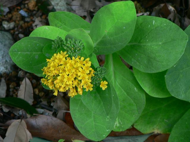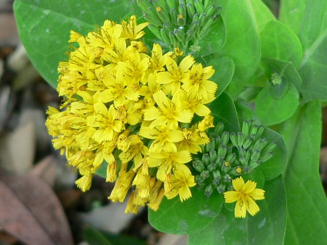 海菜(ワダン) 秋の花 2011年10月30日 海菜(ワダン)はキク科アゼトウナ属の越年草である。日本固有種である。千葉県から静岡県にかけてと伊豆諸島に分布し、海岸の崖や礫地に生える。和名の由来であるが、「わた」は海の古語で、「わた」+「菜」=「ワタナ」の転訛したものとの説がある。草丈は30~60センチくらいである。根は太くて長い。葉は円形ないしへら形で分厚く、根際から密生する。茎や葉を切ると白い乳液が出る。開花時期は7~11月である。花茎が放射状に出て斜上し、茎先に黄色い花(頭花)がたくさんつく。花の後にできる実はそう果(熟しても裂開せず、種子は1つで全体が種子のように見えるもの)である。属名の Crepidiastrum はギリシャ語の「Crepis(フタマタタンポポ属)+astrum(似た)」からきている。種小名の platyphyllum は「広い葉の」という意味である。写真は11月につくば植物園で撮った。学名:Crepidiastrum platyphyllum★岩肌にへばりつき咲く黄の花は 海との縁をその名に刻み花図鑑植物図鑑PR