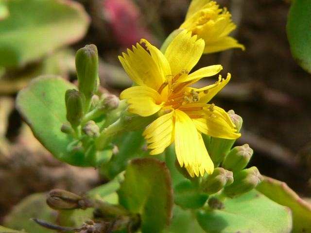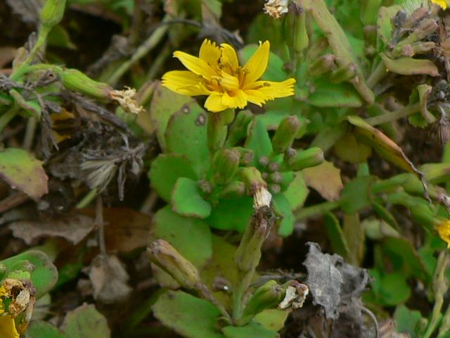 畔唐菜(アゼトウナ) 秋の花 2011年10月06日 畔唐菜(アゼトウナ)はキク科アゼトウナ属の多年草である。漢字では「畔冬菜」とも書く。日本固有種である。本州の静岡県から九州にかけて分布し、太平洋側の海岸の岩場に生える。草丈は5~15センチくらいである。根際から生える葉は分厚い倒卵形で、ロゼット状(茎から葉が重なり合って出て地に接し、円座形になったもの)となる。葉の縁にはぎざぎざ(鋸歯)があり、先は丸い。茎につく葉は小さく、互い違いに生える(互生)。開花時期は8~12月である。枝分かれをした茎先に散房花序(柄のある花がたくさんつき、下部の花ほど柄が長いので花序の上部がほぼ平らになる)を出し、花径15ミリくらいの黄色い花(頭花)をつける。花の後にできる実はそう果(熟しても裂開せず、種子は1つで全体が種子のように見えるもの)である。花は薬師草(ヤクシソウ)とよく似ている。また、日本海側の海岸にはよく似た細葉海菜(ホソバワダン)が咲く。属名の Crepidiastrum はギリシャ語の「Crepis(フタマタタンポポ属)+astrum(似た)」からきている。種小名の keiskeanum は明治初期の植物学者「伊藤圭介さんに関係した」という意味である。写真は9月に小石川植物園で撮った。学名:Crepidiastrum keiskeanum★岩肌に貼りつくように畔冬菜 海の青さと響き合い咲く花図鑑植物図鑑