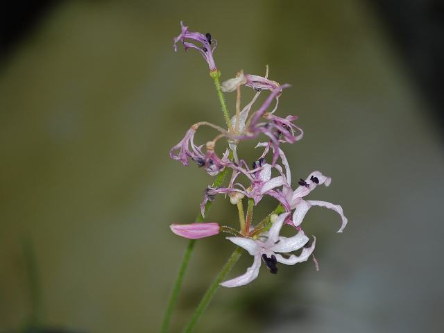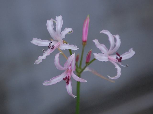ネリネ・プラティペタラ 秋の花 2011年10月07日 ネリネ・プラティペタラはヒガンバナ科ネリネ属の常緑多年草である。原産地は南アフリカである。北部のムプマランガ州に分布し、沼地に生える。草丈は30~50センチくらいである。根際から生える葉は線形である。開花時期は9~10月である。茎先に散形花序(枝先に1個つずつ花がつく)を出し、花径2センチくらいの淡い紅紫色の花をつける。花被片は反り返らない。花の柄には毛が生えている。花の後にできる実はさく果(熟すると下部が裂け、種子が散布される果実)である。属名の Nerine はギリシャ神話の海の女神「ネレイス(Nereis)」からきている。種小名の platypetala は「広い花弁の」という意味である。写真は9月につくば植物園で撮った。学名:Nerine platypetala★謎秘めた花に出合ってご満悦 原種ならばの魅力に触れて花図鑑植物図鑑