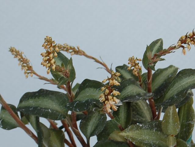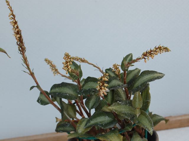 屋久島繻子蘭(ヤクシマシュスラン) 秋の花 2011年10月08日 屋久島繻子蘭(ヤクシマシュスラン)はラン科シュスラン属の多年草である。九州の南部と屋久島に分布し、山地の林の中に生える。草丈は10~20センチくらいである。茎はつけ根の部分が地を這い、上部は立ち上がる。葉は卵形で、互い違いに生える(互生)。葉の中央に白い筋が入る。開花時期は10月である。茎先に総状花序(柄のある花が花茎に均等につく)を出し、白い小さな花を密につける。唇弁のつけ根の膨れた部分が白くなる。和名の由来は、屋久島で発見され葉に「繻子」のような艶があるというところからきている。基本種は八丈繻子蘭(ハチジョウシュスラン)で、同一とする見解もある。属名の Goodyera はイギリスの植物学者「グッドイヤー(John Goodyer)さん」の名からきている。種小名の hachijoensis は「八丈島の」という意味である。変種名の yakushimensis は「屋久島の」という意味である。写真は10月に神代植物公園の野草展(東京山草会)で撮った。学名:Goodyera hachijoensis var. yakushimensis★土地土地に少し異なる花がある 自然の示す不思議ここにも花図鑑植物図鑑