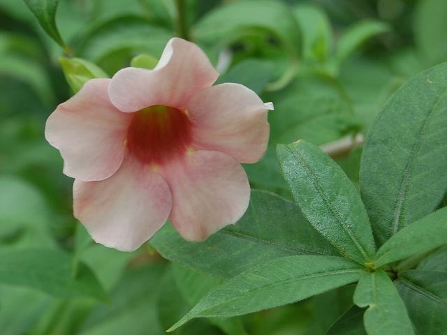 アラマンダ・ビオラケア 四季咲きの花 2011年10月09日 アラマンダ・ビオラケアはキョウチクトウ科アリアケカズラ属(アラマンダ属)の蔓性常緑低木である。種小名の読み方は「ヴィオラケア」や「ウィオラケア」とするものもある。原産地はブラジルである。沖縄では地植えしたものが見られる。和名は紫有明葛(ムラサキアリアケカズラ)である。細い枝を這わせて伸びる。葉は長い楕円形で、向かい合って生える(対生)。3~4枚が輪生する場合もある。葉の色は明るい緑色で、軟らかい毛が生える。開花時期は5~10月くらいである。温度さえ合えば周年開花をする。花径7~8センチセンチの紅紫色をした漏斗形の花をつける。花冠の先は5つに裂ける。花の後にできる実は袋果(熟すと果皮が自然に裂けて種子を放出する)である。属名の Allamanda はスイス人の植物学者「アラマン(J. N. S. Allamand)さん」の名からきている。種小名の violacea は「菫色の」という意味である。写真は9月に大阪市の咲くやこの花館で撮った。学名:Allamanda violacea★紫の色が眩しいアラマンダ 色の違いでイメージ違い花図鑑植物図鑑
