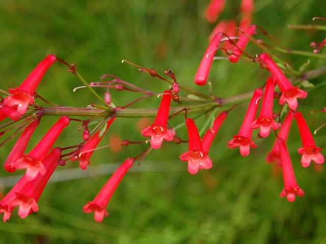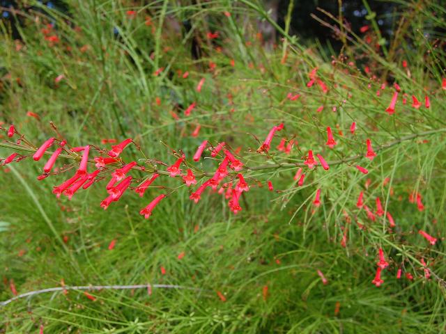 花丁字(ハナチョウジ) 四季咲きの花 2011年10月10日 花丁字(ハナチョウジ)はゴマノハグサ科ハナチョウジ属の常緑低木である。原産地はメキシコである。草丈は1~2メートルである。葉は退化して小さく、鱗片状(葉の変形したもの)である。開花時期は5~10月である。沖縄などでは周年開花する。花は紅色で筒状である。枝先にまとまってつくので、細い枝は枝垂れる。花冠の先は4つに裂け、横から見ると「丁」の字のように見える。花の後にできる実はさく果(熟すると下部が裂け、種子が散布される果実)である。属名のラッセリア(Russelia)の名でも流通している。属名の Russelia はフランスの植物学者「ラッセル(A. Russell)さん」の名からきている。 種小名の equisetiformis は「トクサ属(Equisetum)のような形の」という意味である。写真は12月に沖縄県本部町の熱帯・亜熱帯都市緑化植物園で撮った。学名:Russelia equisetiformis★枝垂れ咲く景色艶やか花丁字 南国ムード伝えるように花図鑑植物図鑑PR