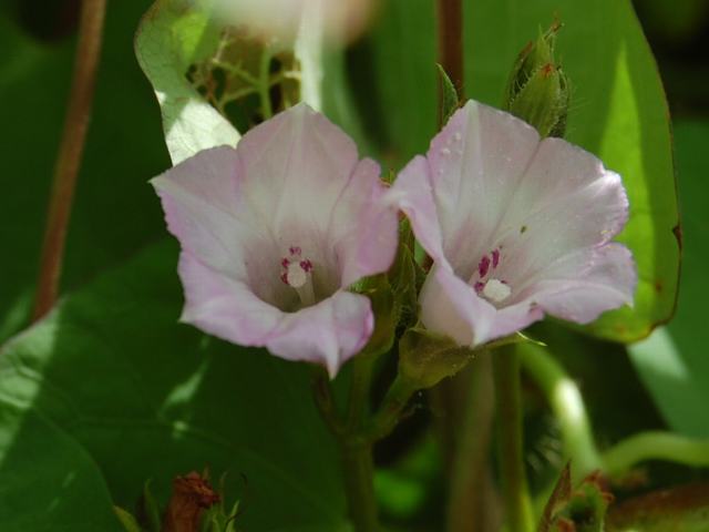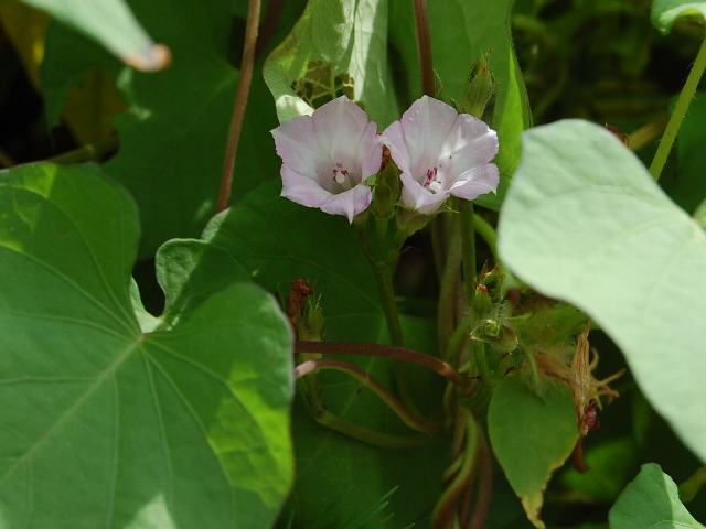 メキシコ朝顔(メキシコアサガオ) 秋の花 2011年09月30日 メキシコ朝顔(メキシコアサガオ)はヒルガオ科サツマイモ属の蔓性一年草である。原産地はメキシコである。日本では逸出したものが野生化している。草丈は3メートルくらいになる。葉はほこ形だが、切れ込まないものもある。開花時期は8~9月である。紅紫色をした漏斗状の花をつける。花径は15~20ミリくらいと小さい。花の後にできる実はさく果(熟すると下部が裂け、種子が散布される果実)である。属名の Ipomoea はギリシャ語の「ips(芋虫)+homoios(似た)」からきている。物に絡みついて這い登る性質からから名づけられた。種小名の trifida は「3つに分かれた」という意味である。写真は9月に木場公園の外来植物園で撮った。学名:Ipomoea trifida★朝顔と言うには少し小さいな 薩摩芋の花こんならしいよ花図鑑植物図鑑