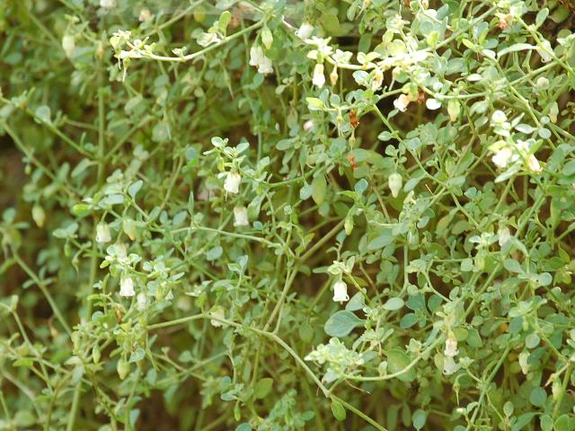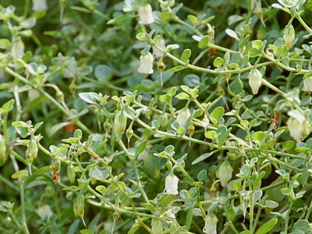 繁縷酸漿(ハコベホオズキ) 秋の花 2011年10月01日 繁縷酸漿(ハコベホオズキ)はナス科ハコベホオズキ属の蔓性一年草である。原産地は南アメリカである。日本へは明治時代の中期に小石川植物園へ輸入された。現在では逸出したものが野生化し、本州の関東地方から九州にかけて分布する。和名の由来は、葉が繁縷(ハコベ)に似ることからきている。草丈は60~100センチくらいである。蔓は長さが数メートルになる。全草に悪臭がある。茎や葉には圧毛(茎や葉に密着して寝た毛)が密生し、白っぽい。葉は卵円形で、互い違いに生える(互生)。葉の先は丸く、縁にぎざぎざ(鋸歯)はない。開花時期は5~10月である。葉の脇に花径5~6ミリの小さな鐘形の白い花を1つずつつける。花冠の先は5つに裂ける。雄しべは5本、雌しべは1本である。花の後にできる実は液果(果皮が肉質で液汁が多い実)で、白や黄色に熟する。属名の Salpichroa はギリシャ語の「salpinx(筒状)+khroia(肌の色)」からきている。種小名の rhomboidea は「長い菱形の」という意味である。写真は9月に木場公園の外来植物園で撮った。学名:Salpichroa rhomboidea★可愛いが根を張らせると大変だ 繁縷酸漿はやっかいな花花図鑑植物図鑑