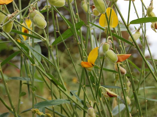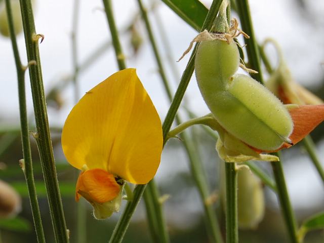 サンヘンプ 秋の花 2011年10月02日 サンヘンプ(Sunhemp)はマメ科タヌキマメ属の一年草である。原産地はインドなどの熱帯地方である。日本へは線虫対策などのために導入されている。また、ロープの材料となったりする繊維植物でもある。流通名をこぶとり草(コブトリソウ)ともいう。逸出したものが一部で野生化している。草丈は60~200センチくらいである。葉は披針形(笹の葉のような形)で、互い違いに生える(互生)。開花時期は7~10月である。直立した茎から枝がたくさん出て、蝶形をした黄色い小花を総状につける。花の後にできる実は円筒形の豆果(莢の中に種子が入るもの)である。属名の Crotalaria はギリシャ語の「crotalon(玩具のガラガラ)」からきている。莢の中で種子がガラガラ鳴ることから名づけられた。種小名の juncea は「イグサ属(Juncus)に似た」という意味である。写真は9月に木場公園の外来植物園で撮った。学名:Crotalaria juncea★見上げ見る背高のっぽのサンヘンブ 黄色い花はマメ科の印花図鑑植物図鑑