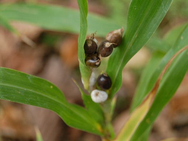 数珠玉(ジュズダマ) 果実・野菜 2011年10月03日 数珠玉(ジュズダマ)はイネ科ジュズダマ属の多年草である。本州から沖縄にかけて分布し、原野や道端などに生える。原産地は熱帯アジアである。日本へは古い時代に渡来し栽培されていたものが野生化した。草丈は1~2メートルである。葉は玉蜀黍(トウモロコシ)に似た線状の披針形で、互い違いに生える(互生)。長さは30~60センチ、幅は2~4センチで先が尖り、縁はざらつく。中央脈は白く、つけ根の部分は茎を抱く。開花時期は7~10月である。雌雄同株である。上部の葉の脇からたくさんの花穂を立てる。硬くて艶のある壷(苞鞘)の中に雌花穂があり、その先に雄花穂が垂れ下がる。果期になると、苞鞘は白、灰色、灰褐色、黒などに色づく。これに糸を通して数珠のようにつなげて遊んだのが名の由来である。根は生薬で川穀根(せんこくこん)といい、煎じて飲むとリューマチ、神経痛、肩こりなどに効く。種子は川穀(せんこく)といい、煎じて飲むと美肌保全、健胃、解熱、利尿などの薬効がある。俳句の季語は秋である。属名の Coix はギリシャ語の「coix(シュロ)」からきている。種小名の lacryma-jobi は「ヨブの涙(花序の印象をたとえた)」という意味である。写真は10月に市川市万葉植物園で撮った。学名:Coix lacryma-jobi ★数珠玉を連ねなむなむ経読めば 身じろぎもせず聴く友の顔花図鑑植物図鑑