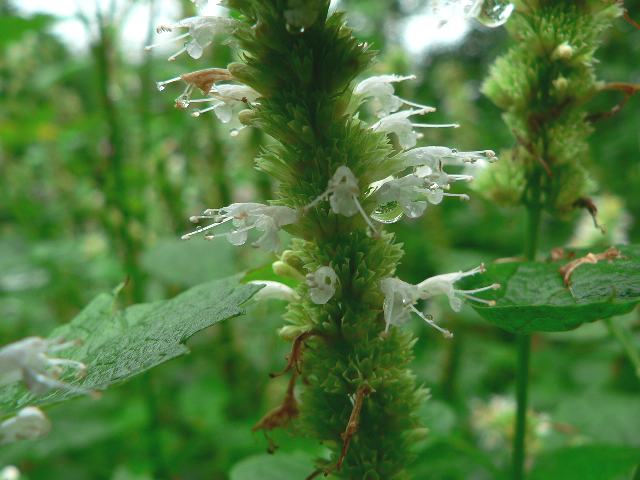 アニスヒソップ 秋の花 2011年10月05日 アニスヒソップ(anise hyssop)アガスタシェはシソ科カワミドリ属の多年草である。原産地は北アメリカ、中央アメリカである。日本原産の蕾香(カワミドリ)と同じ仲間である。葉がセリ科のアニスに似た香りがあるためこう呼ばれている。ヒソップ(hyssop)はヤナギハッカの仲間のことである。学名のアガスタシェ・フォエニクルムで表示するものもある。葉は乾燥させて漢方薬やカレー料理などの香辛料に用いられる。草丈は50~100センチくらいである。葉は卵形で、向かい合って生える(対生)。開花時期は6~10月である。茎先に穂状の総状花序(柄のある花が花茎に均等につく)を出し、唇形の花をつける。花の色は薄紫色、ピンク、白などがある。花期が長く、蜜源植物となっている。属名の Agastache はギリシャ語の「aga(強める)+stachys(穂)」からきている。太い穂状の花序をつけることから名づけられた。種小名の foeniculum は「(セリ科)ウイキョウ属」のことである。写真は10月に京都府立植物園で撮った。園芸品種のハニービーホワイト(Honeybee White)である。学名:Agastache foeniculum★蜜蜂を呼び寄せようと香を放つ アガスタシェは柔和な姿花図鑑植物図鑑PR