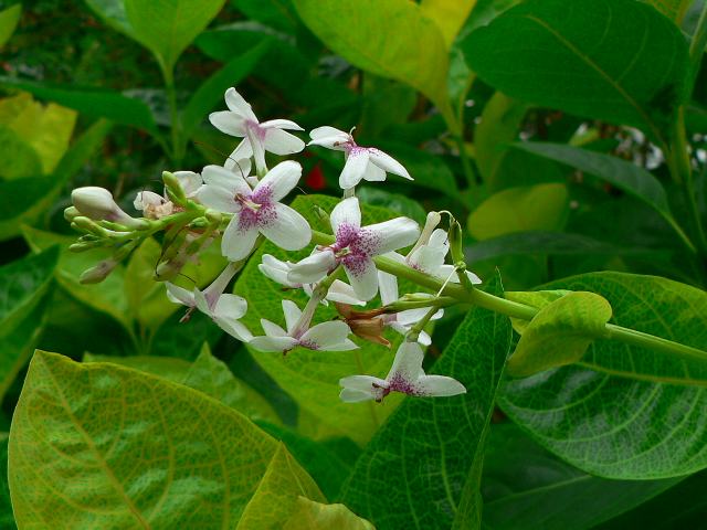 丸葉瑠璃花笠擬き(マルバルリハナガサモドキ) 秋の花 2011年09月20日 丸葉瑠璃花笠擬き(マルバルリハナガサモドキ)はキツネノマゴ科ルリハナガサモドキ属の常緑小低木である。原産地は南太平洋である。学名からプセウデランテムム・レティクラツム・オバリフォリウムやプセウデランテムム・オバリフォリウムなどの名でも表示されている。瑠璃花笠擬き(ルリハナガサモドキ)の変種である。樹高は1メートルくらいである。葉は幅の広い楕円形で、向かい合って生える(対生)。葉は緑色から黄色へと変化する。開花時期は8~10月である。暖地では周年開花をする。花の色は白くて先が4つに裂け、花の真ん中は赤紫色である。花の後にできる実はさく果(熟すると下部が裂け、種子が散布される果実)である。属名の Pseuderanthemum はギリシャ語の「pseudo(偽)+Eranthemum(ルリハナガサ属)」からきている。ルリハナガサ属に似たという意味合いである。種小名の reticulatum は「網状の」という意味である。変種名の ovarifolium は「広楕円形の葉の」という意味である。写真は1月に神奈川県立フラワーセンター大船植物園で撮った。学名:Pseuderanthemum reticulatum var. ovarifolium★南海の島が似合うね瑠璃の色 白との調和ただ美しく花図鑑植物図鑑