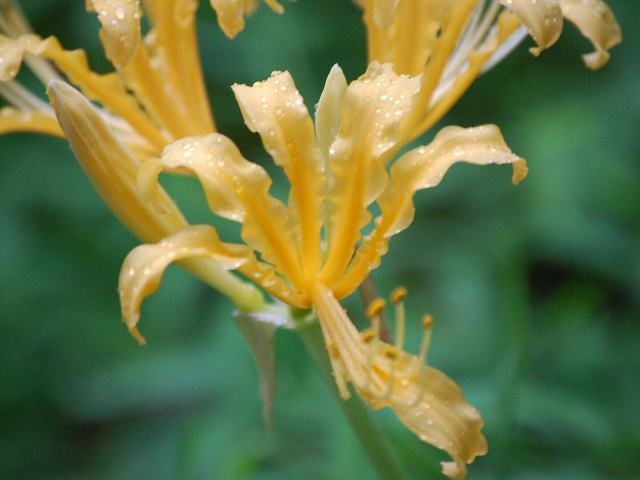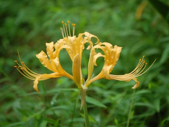 リコリス・アフリカーナ 秋の花 2011年09月22日 リコリス・アフリカーナはヒガンバナ科ヒガンバナ属の多年草である。異名をリコリス・アウレアという。原産地は中国の南部や台湾、ミャンマーなどである。アフリカーナの名は、南アフリカ産と誤認されてつけられたようである。草丈は50センチくらいである。根際から生える葉は線形で、開花と同時に展開する。葉の先は鋭く尖り、裏面は粉白色を帯びる。葉は翌春に枯れる。開花時期は9~10月である。花の色はクリーム色で、上向きに咲く。花被片は6枚で強く反り返り、雄しべと雌しべが突き出る。花の後にできる実はさく果(熟すると下部が裂け、種子が散布される果実)である。鍾馗水仙(ショウキズイセン)の名でも流通しているが、鍾馗水仙(ショウキズイセン)の学名は Lycoris traubii で本種とは異なる。属名の Lycoris はギリシャ神話の海の女神「リコリス(Lycoris)」の名からきている。花の美しさを称えて名づけられた。種小名の africana は「アフリカの」という意味である。写真は9月につくば植物園で撮った。学名:Lycoris africana(=Lycoris aurea)★あれこれは鍾馗蘭かと見紛うて 違いを知れば楽しさ広がり花図鑑植物図鑑