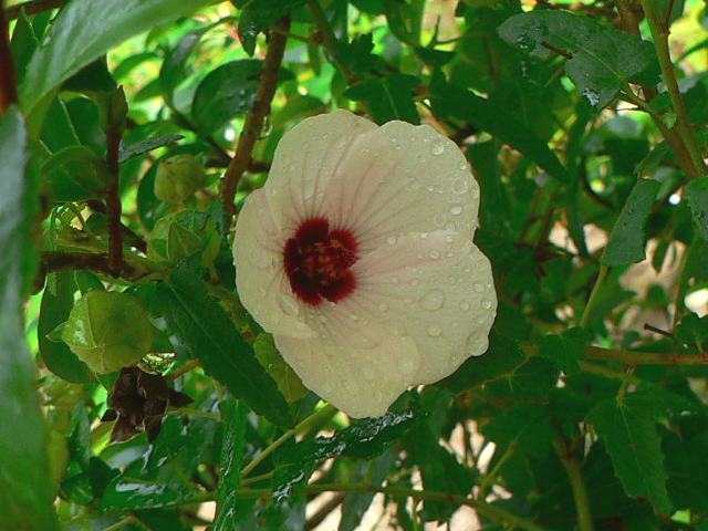 矢の根梵天花(ヤノネボンテンカ) 秋の花 2011年09月23日 矢の根梵天花(ヤノネボンテンカ)はアオイ科ヤノネボンテンカ属(パポニア属)の常緑低木である。原産地は南アメリカである。日本へ渡来した時期は不明である。日本でも帰化していて、道ばたなどに生える。草丈は100~150センチくらいである。茎は下部でよく枝分かれをして、横に広がる。葉はくさび形で矢じりの形に似ている。葉の縁にはぎざぎざ(鋸歯)がある。この葉の形が「矢の根」の名の由来になっている。「梵天」は婆羅門天のことだが、同時に山伏の峰入り行列の先頭に立てたりする御幣(ごへい)をも意味する。花の形をこの「梵天」に見立てたものであろう。同じアオイ科に梵天花(ボンテンカ)という花がある。開花時期は8~9月である。花径は5~7センチくらいで、花びらは白く真ん中が濃い赤褐色をしている。また、花びらの裏側にはきれいな濃い赤色の筋が入っている。花の後にできる実はさく果(熟すると下部が裂け、種子が散布される果実)である。別名を高砂芙蓉(タカサゴフヨウ)という。属名の Pavonia はスペインの植物学者「パボン(J. A. Pavon)さん」の名からきている。種小名の hastata は「鉾形の」という意味である。写真は10月に京都府立植物園で撮った。学名:Pavonia hastata★あっさりと咲いているよな振りをして 花の裏には綺麗な模様花図鑑植物図鑑