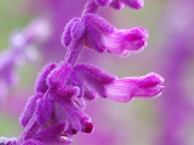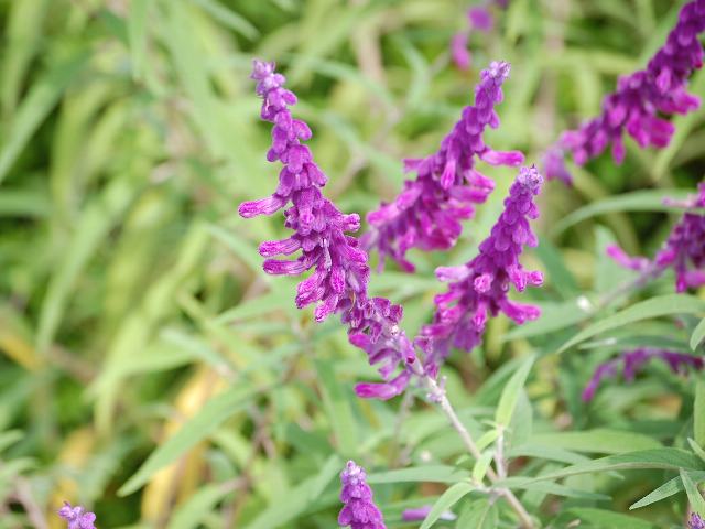 メキシカンブッシュセージ 秋の花 2011年09月24日 メキシカンブッシュセージ(Mexican bush sage)はシソ科アキギリ属の多年草(半低木)である。メキシカンセージ(Mexican sage)とも呼ぶ。原産地は北アメリカから中南アメリカにかけてで、ポピュラーな観賞用ハーブである。別名をアメジストセージ(amethyst sage)という。ベルベットセージ(velvet sage)と呼ばれることもある。草丈は100~150センチくらいである。茎の断面は四角形で、2年目から下部は木質化する。葉は長い披針形(笹の葉のような形)で、十の字状に向かい合って生える(十字対生)。葉には軟毛が生えており、先は鋭く尖る。葉の色は淡い緑色で、よい香りがする。開花時期は9~11月である。短日植物で、日差しが短くなると花を開く。茎先に10~30センチくらいの総状花序(柄のある花が花茎に均等につく)を斜めに出し、唇形の花をつける。萼は紅紫色で、ビロード状の軟毛に覆われている。花の色は白いものと紫色のものがある。雄しべは5本あるが、そのうちの3本は退化している。雌しべは1本で、先は2つに裂ける。花の後にできる実は分果(複数の子房からできた果実)で、4つのブロックからなる。葉を乾燥させたものを生薬でセージ葉といい、芳香性健胃薬とされる。属名の Salvia はラテン語の「salvare(治療)」からきている。薬用になるものが多いことから名づけられた。種小名の leucantha は「白い花の」という意味である。写真は10月に東京都薬用植物園で撮った。学名:Salvia leucantha★ビロードがぽんと弾けて顔を出す 紅紫は夕陽に染まり花図鑑植物図鑑PR