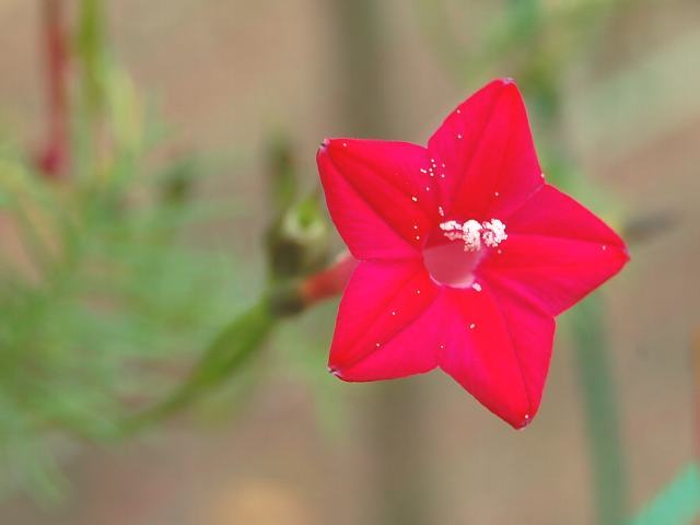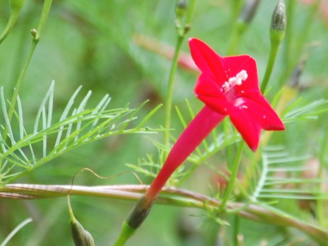 縷紅草(ルコウソウ) 秋の花 2011年09月08日 縷紅草(ルコウソウ)はヒルガオ科サツマイモ属の蔓性多年草である。分類の仕方によってはルコウソウ属とされる。寒さに弱いので、園芸上は一年草として扱われる。原産地は南アメリカである。草丈は40~50センチくらいである。葉は羽状に深く裂け、糸のように細かい。開花時期は8~10月である。細い筒状で先が星状に浅く5つに裂けた真紅の花をつける。花の後にできる実はさく果(熟すると下部が裂け、種子が散布される果実)である。近縁種に、葉に切れ込みがない丸葉縷紅草(マルバルコウソウ)がある。また、両者が交雑育成されたのが羽衣縷紅草(ハゴロモルコウソウ)である。俳句の季語は夏である。属名の Ipomoea はギリシャ語の「ips(芋虫)+homoios(似た)」からきている。物に絡みついて這い登る性質からから名づけられた。種小名の quamoclit はギリシャ語の「kyamos(豆)+clitos(低い)」からきており、マメのように蔓性で背丈が低いという意味から名づけられた。写真は9月に東京都薬用植物園で撮った。学名:Ipomoea quamoclit★小さくも真っ赤に燃える縷紅草 陽射しに映えるパッションの色花図鑑植物図鑑