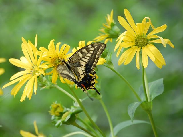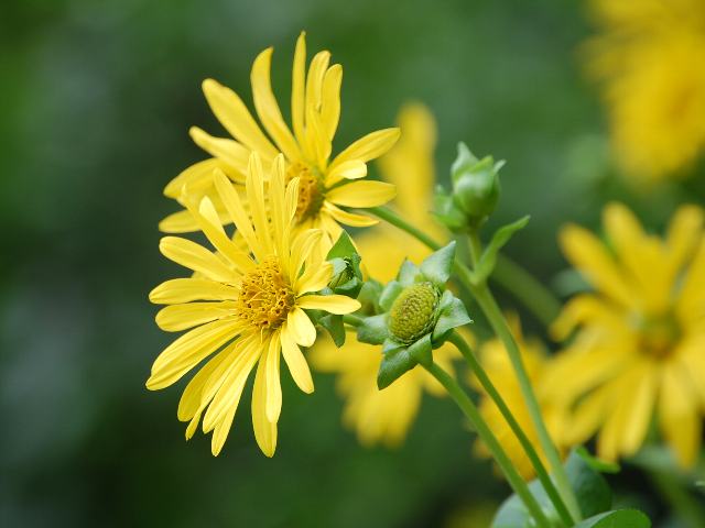 四角向日葵(シカクヒマワリ) 夏の花 2011年09月04日 四角向日葵(シカクヒマワリ)はキク科テトラゴノテカ属の一年草である。向日葵(ヒマワリ)に近い仲間である。原産地は北アメリカの南東部である。和名の由来は、茎が四角いところからきている。草丈は2~3メートルくらいである。茎は直立をする。葉は心形で、向かい合って生える(対生)。葉の先は尖り、つけ根の部分は茎を抱く。開花時期は6~8月である。茎の上部で枝分かれをして、先に黄色い花(頭花)をつける。花は向日葵(ヒマワリ)ほどは大きくはない。花の後にできる実はそう果(熟しても裂開せず、種子は1つで全体が種子のように見えるもの)である。属名の Tetragonotheca はギリシャ語の「tetra(4つの)+gono(種)+theca(ケース)」からきている。種小名の helianthoides は「ヒマワリ属(Helianthus)のような」という意味である。写真は7月につくば植物園で撮った。学名:Tetragonotheca helianthoides★しげしげと花覗き込み考える 四角向日葵どこが四角い花図鑑植物図鑑