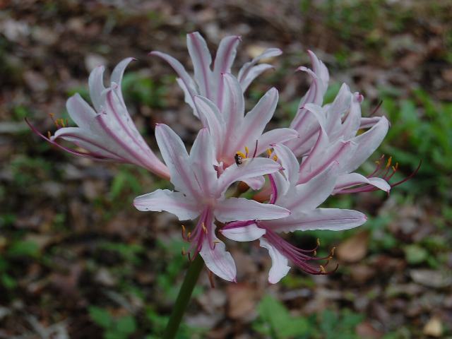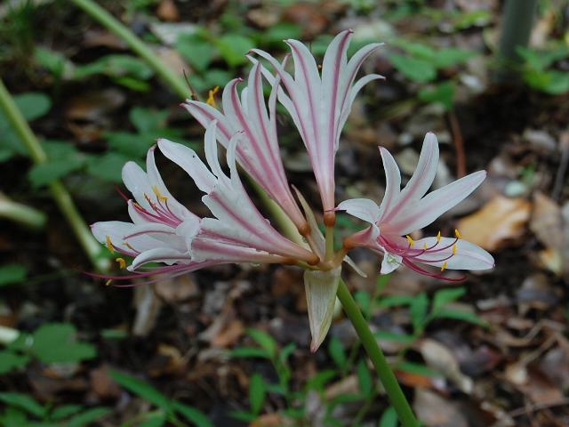 狸の剃刀(タヌキノカミソリ) 秋の花 2011年09月05日 狸の剃刀(タヌキノカミソリ)はヒガンバナ科ヒガンバナ属の多年草である。原産地は中国である。湖北省から雲南省にかけて分布している。日本には自生していないが、観賞用として導入されている。面白い名前だが、狐の剃刀(キツネノカミソリ)を意識したネーミングなのであろう。草丈は50~60センチくらいである。開花時期は8~9月である。淡いピンク色の花被片に、濃いピンクの縦ラインが入っている。花の咲くころには葉は枯れている。結実はしない。属名の Lycoris はギリシャ神話の海の女神「リコリス(Lycoris)」の名からきている。花の美しさを称えて名づけられた。種小名の incarnata は「肉色の」という意味である。写真は8月につくば植物園で撮った。学名:Lycoris incarnata★美しく咲いているのにどことなく 気配怪しい狸の剃刀花図鑑植物図鑑