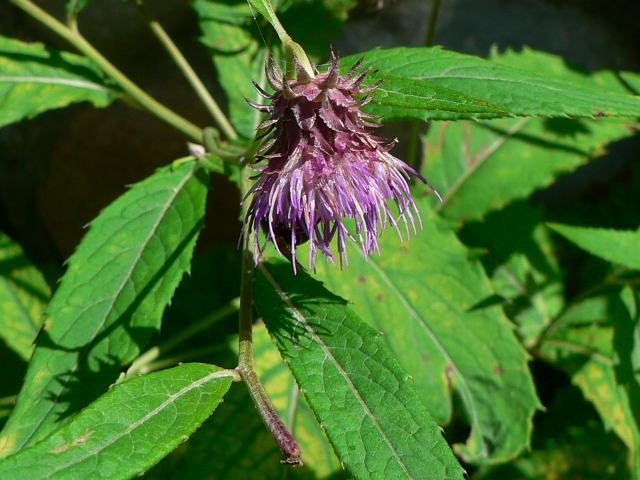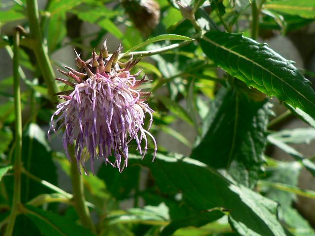 丸葉乗鞍薊(マルバノリクラアザミ) 秋の花 2011年09月06日 丸葉乗鞍薊(マルバノリクラアザミ)はキク科アザミ属の多年草である。日本固有種である。中部地方に分布し、亜高山や高山の林の縁や道端に生える。草丈は100~150センチくらいである。同じ中部地方に分布する乗鞍薊(ノリクラアザミ)の変種である。葉は一般のアザミ類と異なって深い切れ込みがなく、細長い楕円形をしている。基本種には深い切れ込みがある。葉の長さは10~20センチくらいである。葉の裏面には白い毛が密生し、白っぽい。このため雪薊(ユキアザミ)の別名がある。基本種も同様に裏面が白いので、裏白薊(ウラジロアザミ)の別名がある。開花時期は8~10月である。花(頭花)の色は淡い紅紫色で、茎先に横向きか下向きにつく。総苞片(花序全体を包む葉の変形したもの)が長く反り返るのが特徴である。花の後にできる実はそう果(熟しても裂開せず、種子は1つで全体が種子のように見えるもの)である。属名の Cirsium はギリシャ語の「cirsos(静脈腫)」からきている。静脈腫に薬効のある植物につけられた名が転用された。種小名の norikurense は「乗鞍岳の」という意味である。種小名の integrifolium は「全縁葉の」という意味である。写真は9月に上高地で撮った。学名:Cirsium norikurense var. integrifolium★薊でも葉っぱはスマート楕円形 切れ込むだけが能でないから花図鑑植物図鑑