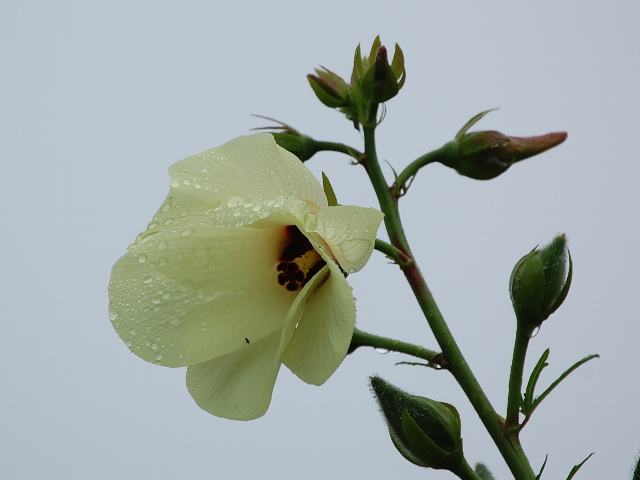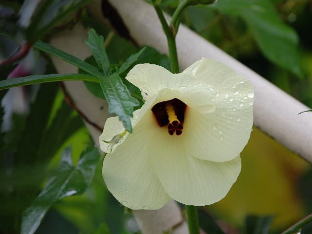 糊麻(ノリアサ) 秋の花 2011年09月07日 糊麻(ノリアサ)はアオイ科オクラ属の一年草である。1944年に京都大学の香川冬夫博士によって作出された栽培植物である。黄蜀葵(トロロアオイ)とオクラとの種間雑種である。両者の性質を持ち合わせており、根からは糊の原料がとれ、果実は食用になる。 草丈は1~2メートルである。葉は手のひら状に深く切れ込み、互い違いに生える(互生)。開花時期は8~9月くらいである。黄色くて中心が暗い紫色をした5弁花をつける。花は一日花である。花の後にできる実はさく果(熟すると下部が裂け、種子が散布される果実)である。和名の由来は、糊の原料となり葉の形が「麻」に似ていることからきている。属名の Abelmoschus はアラビア語の「麝香(abul)+父(mosk)」からきている。種小名の glutinotextilis は「織物に用いるねばついた」という意味である。写真は9月に東京都薬用植物園で撮った。学名:Abelmoschus x glutinotextilis★めずらしい名前の花を紐解けば 先人なせし巧みに出会い花図鑑植物図鑑PR