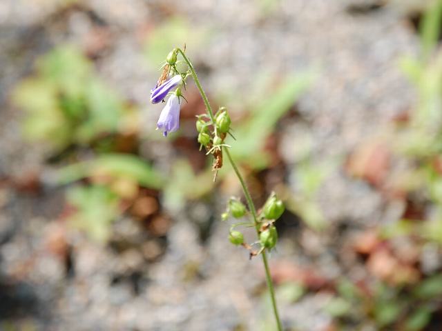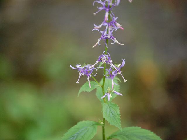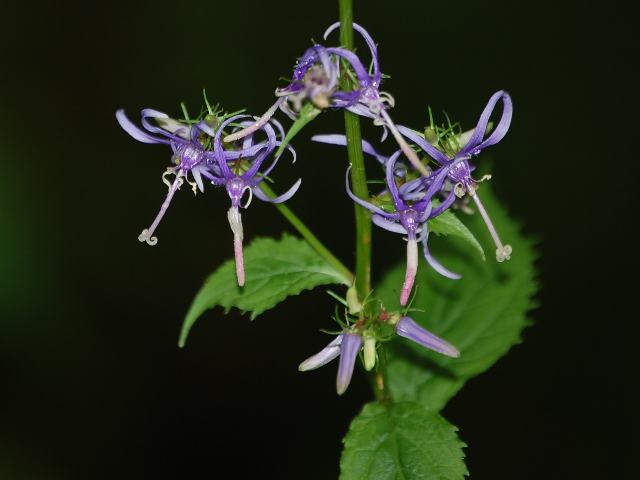 四手沙参(シデシャジン) 夏の花 2011年08月21日 四手沙参(シデシャジン)はキキョウ科シデシャジン属の多年草である。本州と九州に分布し、山地に生える。海外では、朝鮮半島、中国東北部などにも分布する。草丈は50~100センチくらいである。葉は長い卵形で、互い違いに生える(互生)。葉の先は尖り、縁には不規則なぎざぎざ(鋸歯)がある。開花時期は6~8月である。茎先や葉の脇から総状花序(柄のある花が花茎に均等につく)を出し、青紫色の花をつける。花冠は長さ2センチくらいで、細く5つに裂けて反り返る。雄しべは5本である。雌しべの花柱が長く突き出し、柱頭が3つに裂ける。花の後にできる実はさく果(熟すると下部が裂け、種子が散布される果実)である。「四手」というのは「玉串や注連縄(しめなわ)などに下げる紙」のことである。「沙参」は釣鐘人参(ツリガネニンジン)の中国名である。青紫色の花が後ろに反り返った独特の形から四手(シデ)を連想したものといわれる。属名の Asyneuma はギリシャ語の「a(否定)+syn(共に)+aeuma(Phyteuma属の略)」からきている。タマシャジン属とは異なったという意味になる。種小名の japonicum は「日本の」という意味である。写真は8月に日光植物園で撮った。学名:Asyneuma japonicum★造形の不思議を見せる花姿 四手沙参咲く野は深くして