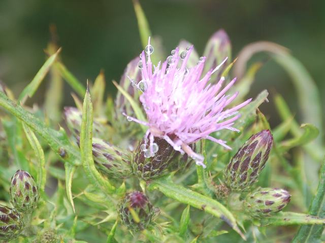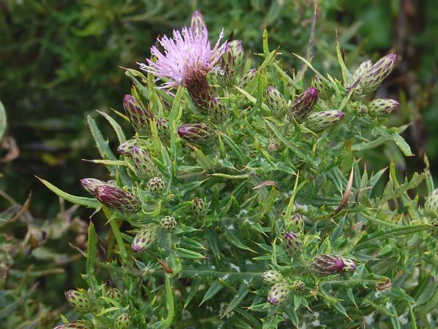 小伊吹薊(コイブキアザミ) 秋の花 2011年08月22日 小伊吹薊(コイブキアザミ)はキク科アザミ属の多年草である。伊吹山の固有種である。山頂に近いお花畑に生える。環境省のレッドリスト(2007)では、「絶滅の危険が増大している種」である絶滅危惧II類(VU)に登録されている。草丈は40センチから100センチくらいである。葉は長い楕円形で、羽状に裂ける。葉には鋭い棘があり、茎に密集する。開花時期は8月から10月である。茎先に淡い紅紫色をした花(頭花)を密につける。花径は2センチくらいである。総苞は筒状で、蜘蛛毛(蜘蛛の巣のような細くからまっている毛)があり粘る。花の後にできる実はそう果(熟しても裂開せず、種子は1つで全体が種子のように見えるもの)である。属名の Cirsium はギリシャ語の「cirsos(静脈腫)」からきている。静脈腫に薬効のある植物につけられた名が転用された。種小名の confertissimum は「密生した」という意味である。写真は8月に伊吹山で撮った。学名:Cirsium confertissimum ★この土地がとても似合いの咲き方に 惚れ惚れとする小伊吹薊花図鑑植物図鑑