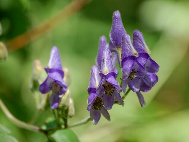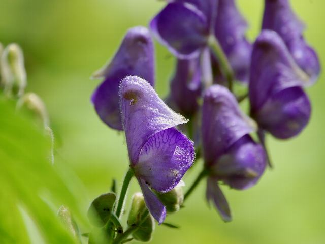 羽前鳥兜(ウゼントリカブト) 秋の花 2011年08月26日 羽前鳥兜(ウゼントリカブト)はキンポウゲ科トリカブト属の多年草である。日本固有種である。「羽前」というのは山形県の旧国名である。蔵王山の山形県側で発見されたのが名の由来である。本州の東北地方と関東地方に分布する。秋田県では絶滅危惧種に指定している。奥鳥兜(オクトリカブト)とよく似ているが、花の柄に腺毛が生えることで区別される。草丈は50~180センチくらいになる。葉は5つから7つに裂けるが、細長い裂片には分かれず丸味がある。裂片の縁には粗いぎざぎざ(鋸歯)があり、重鋸歯(大きなぎざぎざに更に細かなぎざぎざがある)である。開花時期は8~10月である。濃い青紫色の花を咲かせる。花びらのように見えるのは萼である。萼の中に細長い花弁が2枚ある。たくさんの雄しべが見える。花の後にできる実は袋果(熟すと果皮が自然に裂けて種子を放出する)である。属名の Aconitum はギリシャ語の「hierax(=鷹)」からきている。鷹がこの属の植物で目を洗うと考えられたことから名づけられた。種小名の okuyamae は「奥山さんの」という意味である。写真は8月に山形市野草園で撮った。学名:Aconitum okuyamae★峰連ね雪待つ山に花開く 羽前の国に固有の姿花図鑑植物図鑑