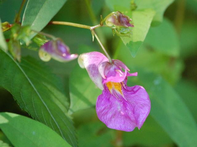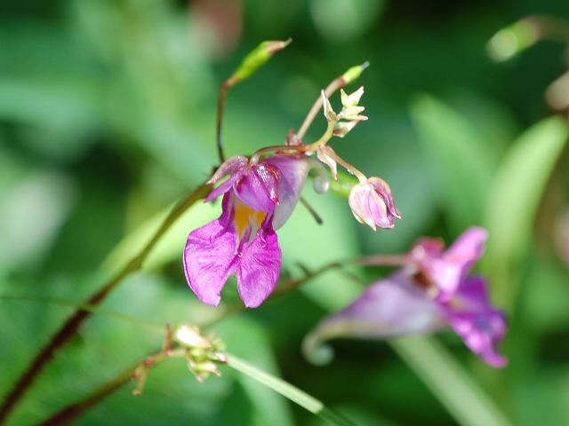 釣船草(ツリフネソウ) 秋の花 2011年08月27日 釣船草(ツリフネソウ)はツリフネソウ科ツリフネソウ属の一年草である。日本各地に分布し、山地の水辺ややや湿った場所に生える。海外では、朝鮮半島、中国東北部にも分布する。草丈は50~80センチくらいである。葉は楕円形で、互い違いに生える(互生)。葉の縁には細かいぎざぎざ(鋸歯)がある。開花時期は8~10月くらいである。葉の脇から花柄を出し、紅紫色の花を数輪ずつつける。花冠は長さが3~4センチの筒状で先が唇形に裂ける。また、距(花冠のつけ根が後ろに飛び出たもの)が後ろに突き出て渦巻き状になる。花の後にできる実はさく果(熟すると下部が裂け、種子が散布される果実)である。花柄から下垂する花の形を釣船に見立てたのが名の由来である。俳句の季語は秋である。属名の Impatiens はラテン語の「impa(否定)+tient(忍耐)」からきている。「我慢できない」という意味で、さく果にさわると急に弾けることから名づけられた。種小名の textorii は採集家「テックストルの」という意味である。写真は8月に山形市野草園で撮った。学名:Impatiens textori★のんびりと棹を垂らして釣船草 派手な衣装で人目気にせず花図鑑植物図鑑