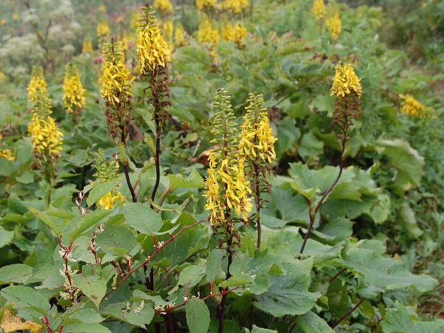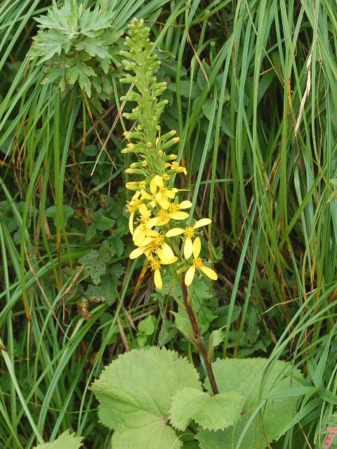 雌宝香(メタカラコウ) 夏の花 2011年08月12日 雌宝香(メタカラコウ)はキク科メタカラコウ属の多年草である。本州から九州にかけて分布し、亜高山帯の湿気の多い草原などに生える。海外では、台湾、中国にも分布する。草丈は60~100センチくらいである。根際から生える葉は長い柄のある三角状の心形で、先は尾状に突き出す。また、つけ根側の両端も尖る。雄宝香(オタカラコウ)の葉は、ほぼ心形である。開花時期は6~9月である。茎先に総状花序(柄のある花が花茎に均等につく)を出し、たくさんの黄色い頭花をつける。真ん中にある筒状花6~11枚である。周りにつく舌状花は1~3枚と極端に少ない。雄宝香(オタカラコウ)の舌状花は5~9枚ある。花の後にできる実はそう果(熟しても裂開せず、種子は1つで全体が種子のように見えるもの)である。「宝香」というのは防虫剤として使われる竜脳香のことである。根茎の香りが似ているということでつけられた名である。「雌」は雄宝香(オタカラコウ)に比べて優しい感じがするところからきている。属名の Ligularia はラテン語の「ligula(舌)」からきている。小さい舌状の花弁から名づけられた。種小名の stenocephala は「細い頭の」という意味である。写真は8月に伊吹山で撮った。学名:Ligularia stenocephala★花びらが落ちてしまった訳じゃない もともとこうさと雌宝香は花図鑑植物図鑑