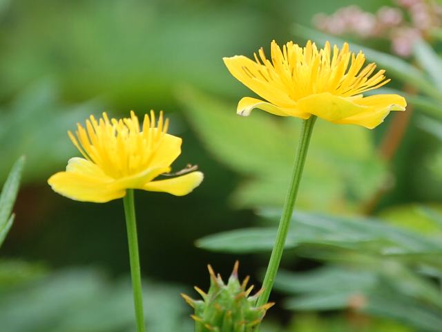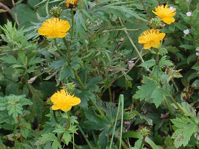金梅草(キンバイソウ) 夏の花 2011年08月13日 金梅草(キンバイソウ)はキンポウゲ科キンバイソウ属の多年草である。日本固有種である。本州の中部地方と伊吹山に分布し、山地から亜高山の林の縁や草地に生える。草丈は40センチから100センチくらいである。葉は円形で深く裂ける。葉には艶がある。開花時期は7月から8月である。枝分かれをした茎先に、花径4センチくらいの黄色ないし黄橙色の花を1輪ずつつける。花弁のように見えるのは萼片で、普通は5枚ある。萼片と雄しべの間に長さ2センチくらいの線形の花弁が8枚から18枚くらいある。花弁は雄しべより長く、近縁種の信濃金梅(シナノキンバイ)は花弁が短い。花の後にできる実は袋果(熟すと果皮が自然に裂けて種子を放出する)の集合果である。和名の由来は、黄金色をした梅に似た花をつけることからきている。属名の Trollius はドイツ語の「Trollblume(セイヨウキンバイソウ)」からきている。種小名の hondoensis は「本州の」という意味である。写真は8月に伊吹山で撮った。学名:Trollius hondoensis★美しい花の姿にはっとする よく似た花を思い浮かべつ